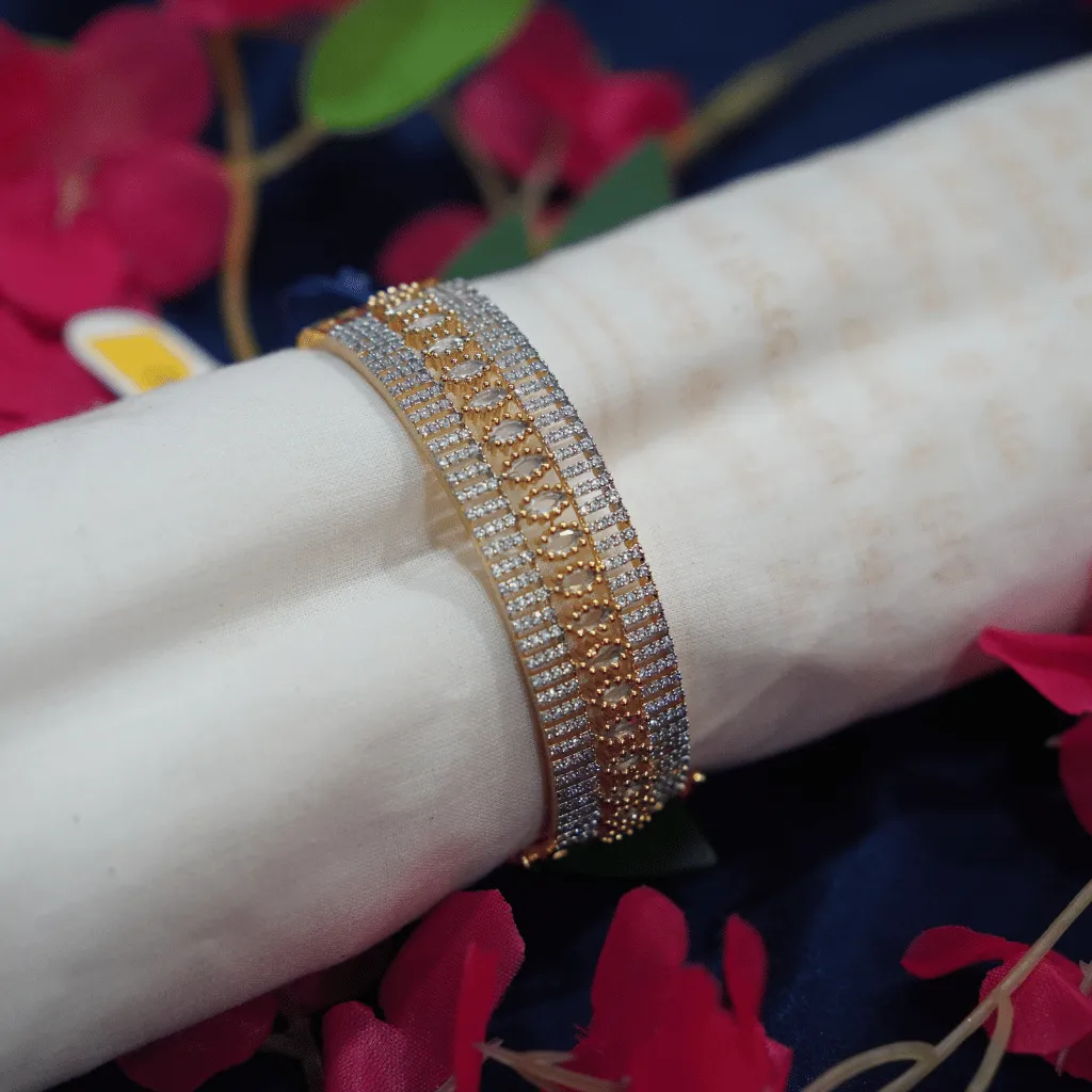 Redefine luxury with this magnificent American Diamond statement kada, a perfect fusion of traditional gold-toned warmth and modern brilliance. The design features a stunning central row of high-luster marquise-cut stones, set in a rhythmic gold-toned frame. Meticulously handcrafted, the band is flanked by multiple rows of micro-set brilliant diamonds, creating a wide, architectural cuff with a diamond-like radiance. This minimalist yet grand piece is an ideal accessory for weddings, engagements, or high-profile cocktail events.