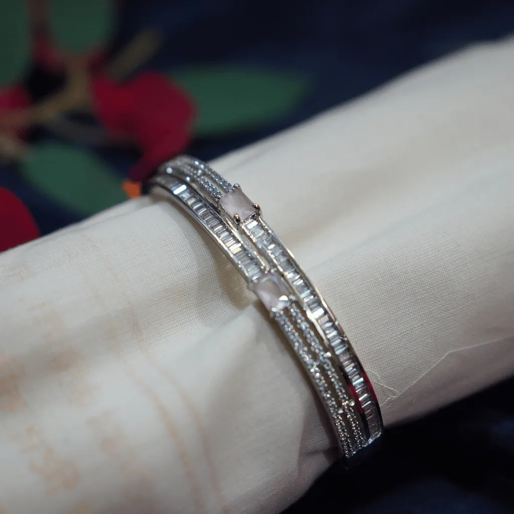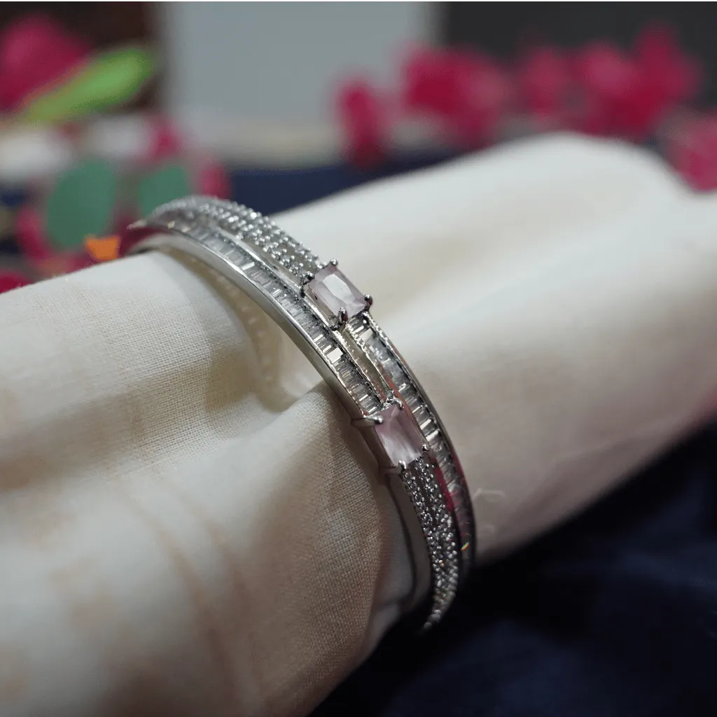 Infuse your ensemble with romantic sophistication with this American Diamond statement bracelet. Centered around two delicate baby pink emerald-cut stones, this piece is bordered by rows of shimmering baguette and brilliant-cut AD stones. The handcrafted silver-toned finish provides a sleek, modern radiance, making it an ideal minimalist luxury accessory for weddings, engagements, or high-end cocktail parties. Its architectural design ensures a high-shine, diamond-like glow from every angle.