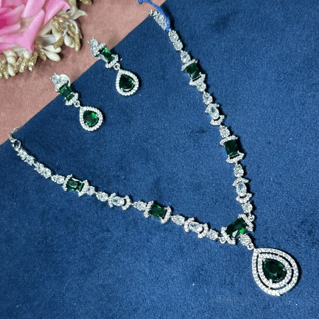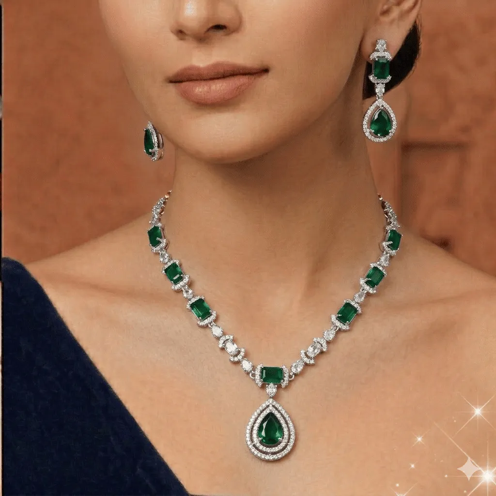 Embrace royal sophistication with this exquisite floral-inspired AD diamond necklace. Delicately handcrafted with brilliant-cut crystals and vibrant emerald accents, this rhodium-finished set offers a luminous, high-jewelry aesthetic. Its lightweight, minimal drape is perfectly curated for the Gen Z bride or bridesmaid, making it a timeless choice for weddings, high-glam engagements, and festive celebrations.