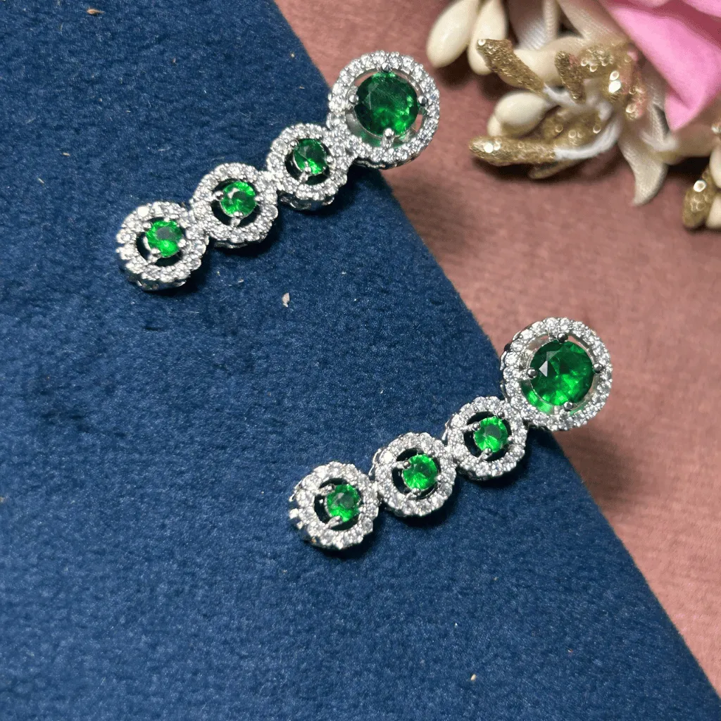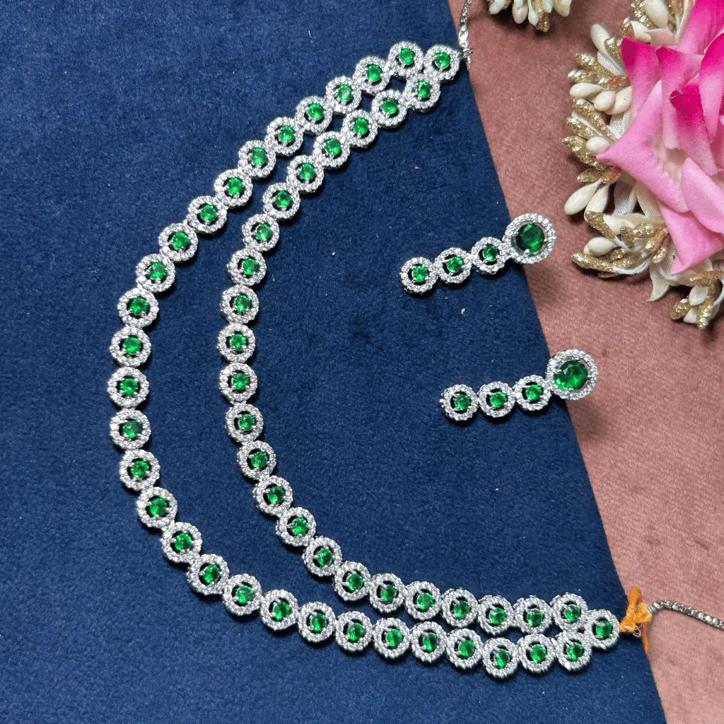 Command attention with this exquisite double-layered AD diamond necklace. Featuring vibrant emerald-hued stones encased in brilliant crystal halos, this rhodium-finished set redefines classic glamour for the modern Gen Z woman. Lightweight and effortlessly chic, it provides the ultimate luxurious statement for engagement parties, weddings, or elevated festive