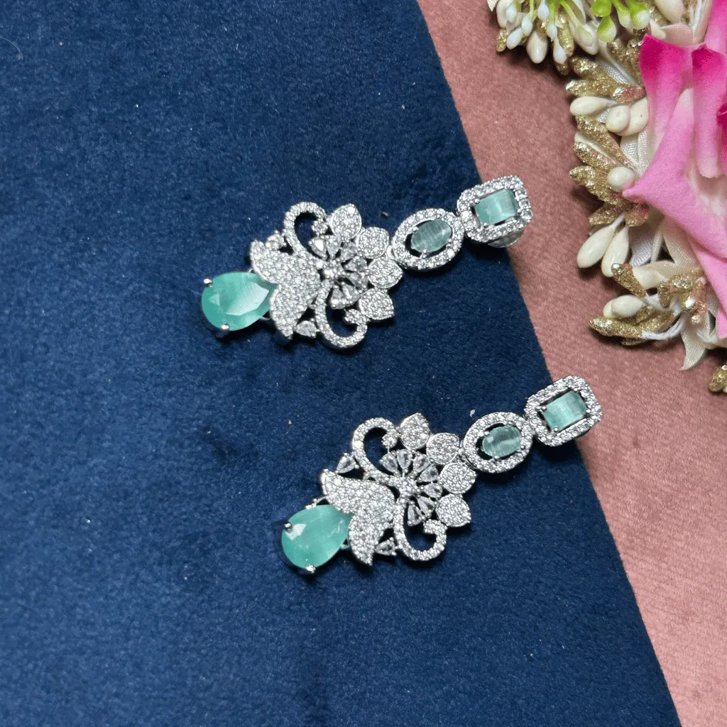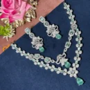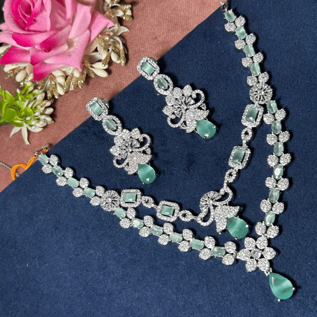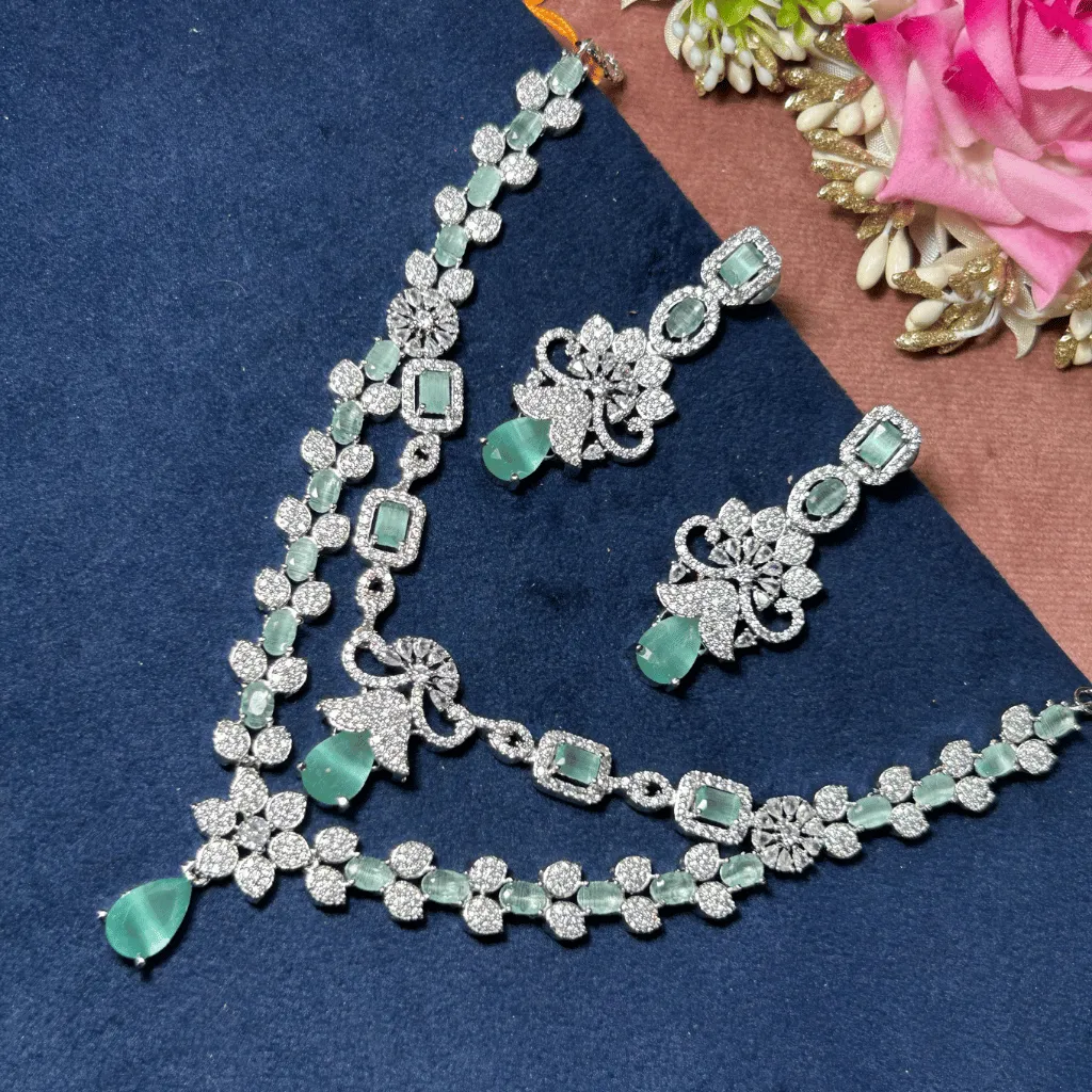 Embrace pastel perfection with this stunning double-tiered AD diamond necklace. Featuring a delicate interplay of mint green stones and brilliant-cut crystals, this rhodium-finished set offers a fresh, modern take on luxury. Its lightweight, layered silhouette is curated for the Gen Z trendsetter, ensuring an unforgettable statement at engagement parties, weddings, or festive galas.