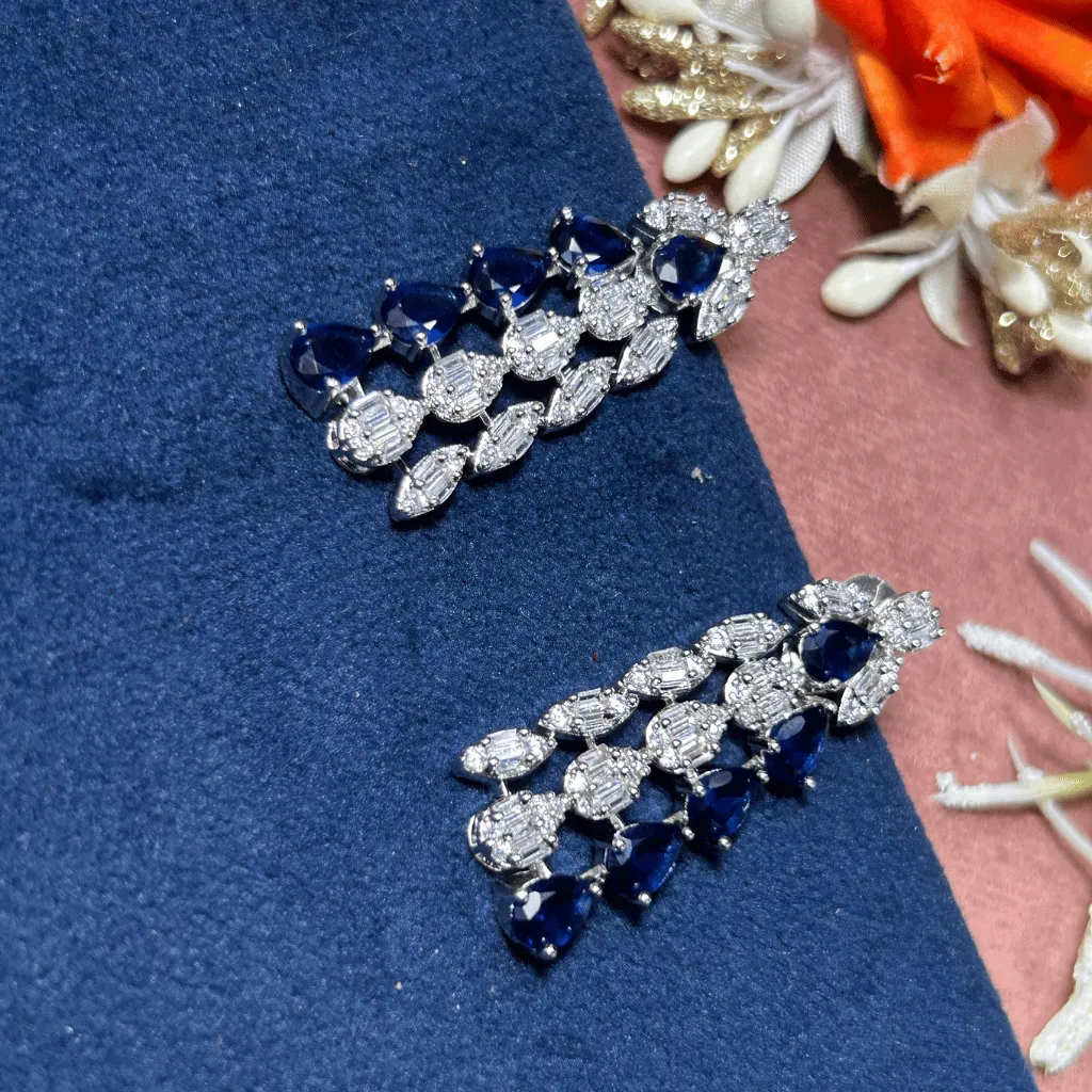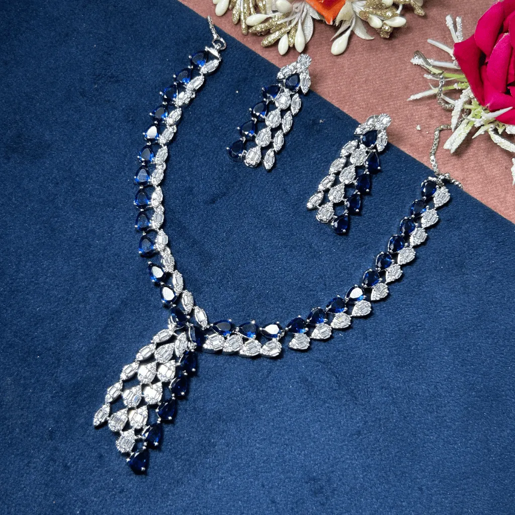 Redefine modern glamour with this exquisite American Diamond necklace. Featuring a stunning dual-tone strand of brilliant-cut stones and rich sapphire blue accents, the design culminates in a dramatic cascading pear drop. This handcrafted jewelry set offers a sleek, minimalist fit with high-end sparkle, making it an unforgettable choice for weddings or a sophisticated engagement ensemble.