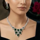 Embrace a look of royal refinement with this American Diamond necklace, available in two enchanting shades: Emerald Green and a soft Pista Green. Featuring a majestic cluster of heart-cut stones and brilliant floral accents, this handcrafted jewelry set offers a high-shine, minimalist finish. Lightweight and opulent, it is a stunning statement piece designed for modern weddings and grand engagement receptions.