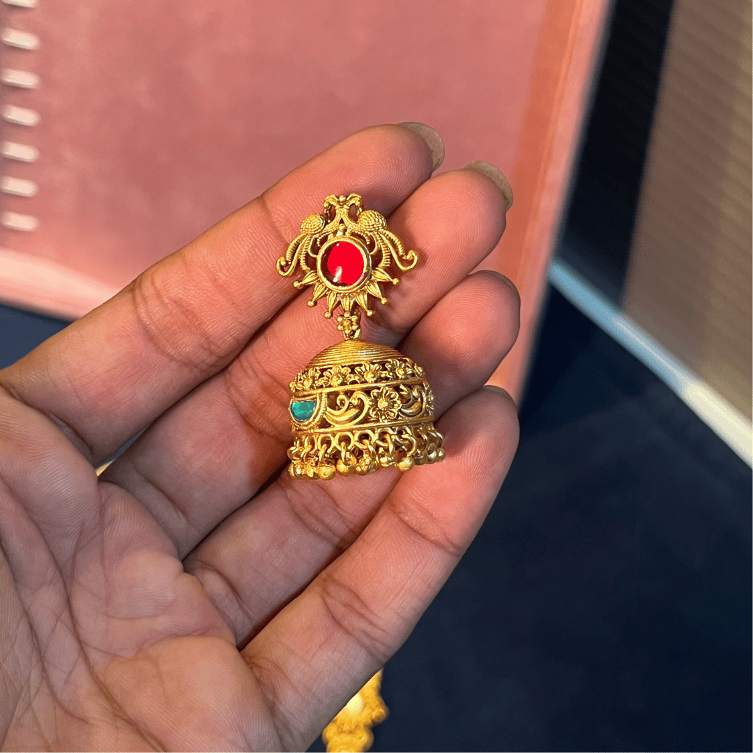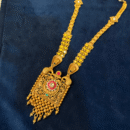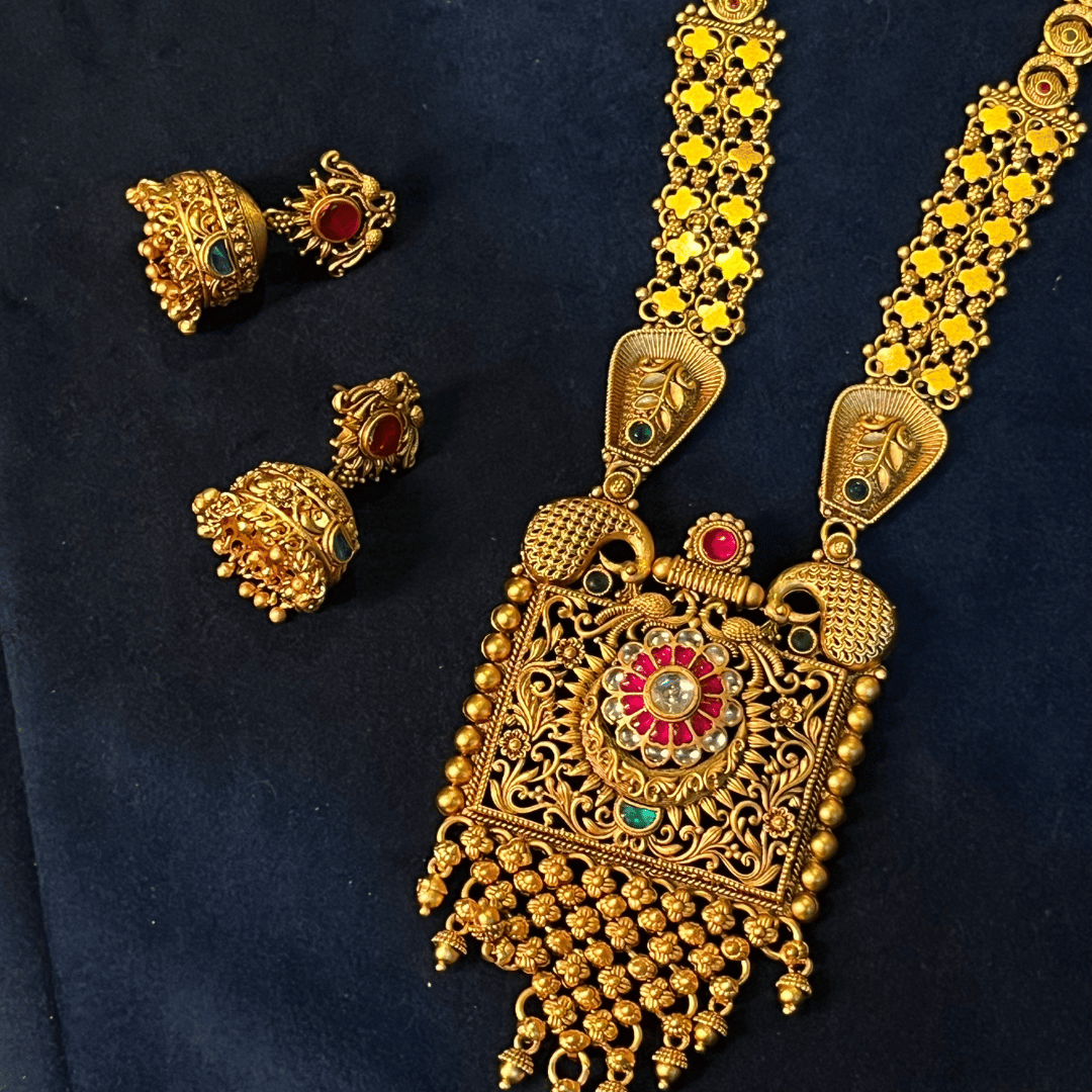 Make a grand statement with this breathtaking Antique Gold Long Haram, a masterpiece of traditional Temple jewelry. The centerpiece features a majestic rectangular pendant with intricate floral filigree, crowned by dual peacock motifs and a radiant ruby-red sunburst center. The long, ornate chain is beautifully handcrafted with textured gold links and delicate mesh-work panels, finished with cascading gold bead clusters. This regal piece is designed for weddings, grand engagements, and heritage-themed celebrations, offering a truly queenly aesthetic.