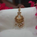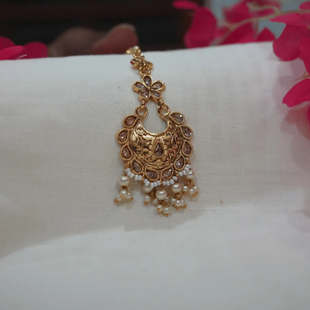 Capture the essence of heritage with this stunning Antique Gold Maang Tikka. Featuring a regal Chandbali (crescent) silhouette, the pendant is meticulously detailed with traditional floral embossing and shimmering Kundan-style stone inlays. The design is elegantly framed by delicate seed pearls and finished with a graceful fringe of pearl clusters, adding a soft, rhythmic movement. Handcrafted with a vintage matte finish, this headpiece is a premier choice for weddings, engagements, or traditional festive celebrations where a royal, timeless look is required.