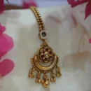 Embrace the soul of traditional Indian artistry with this exquisite Antique Gold Maang Tikka. The pendant features a classic circular sunburst base, crowned by a rich ruby-red floral motif with a shimmering central stone. Below, a crescent-shaped gold station leads to a charming fringe of gold bead droplets. Handcrafted with a textured, vintage finish, the piece is suspended from a regal double-strand gold bead chain accented with a delicate pearl-encircled station. This timeless headpiece is an ideal choice for weddings, engagements, or traditional festive celebrations.