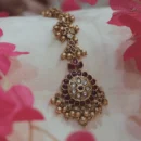 Capture the essence of royal traditions with this breathtaking Antique Gold Maang Tikka. The centerpiece features a grand circular medallion with a shimmering Kundan floral sunburst at its heart, encircled by a regal halo of deep ruby-red stones. Handcrafted with precision, the ornate chain is punctuated by rhythmic gold bead clusters and jewel-toned stations, leading to a majestic fringe of textured gold droplets. This heritage-inspired headpiece is the ultimate accessory for weddings, engagements, or high-profile festive celebrations.