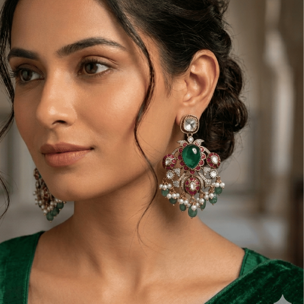 Embody the peak of royal grandeur with these breathtaking Moissanite Kundan Statement Earrings. A true masterpiece of handcrafted heritage jewelry, each piece features a majestic teardrop emerald-green stone at its heart, encircled by a vibrant halo of deep ruby-red accents. The intricate metalwork is encrusted with shimmering Moissanite stones, creating a brilliant, diamond-like radiance. Finished with a lush, rhythmic fringe of high-luster pearls and emerald-toned bead droplets, these earrings are an unparalleled choice for weddings, engagements, or high-profile festive events where you want to channel timeless queenly elegance.