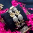 Elevate your ethnic ensemble with the striking artistry of these  Two-Tone statement kadas. This pair features a masterful rhythmic design of textured, oxidized silver melon beads punctuated by radiant gold-toned Kundan floral stations. Each six-petal blossom is meticulously set with shimmering teardrop stones, creating a sophisticated contrast between the rustic tribal silver and the regal gold highlights. Handcrafted with meticulous detail, these kadas offer a bold, architectural presence that is perfect for festivals, weddings, or high-end traditional gatherings.