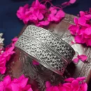 Embrace the intricate charm of heritage craftsmanship with this stunning Oxidized Silver statement kada. This extra-wide architectural bangle features a multi-layered design of delicate filigree-inspired metalwork, showcasing a rhythmic pattern of circular lattices and textured geometric motifs. Handcrafted with meticulous detail, it captures the essence of traditional tribal jewelry with a sophisticated, bold silhouette. This kada is a premier choice for festivals, cultural events, or adding a high-contrast, artisanal edge to your contemporary ethnic ensemble.