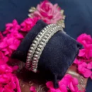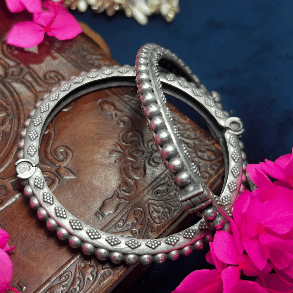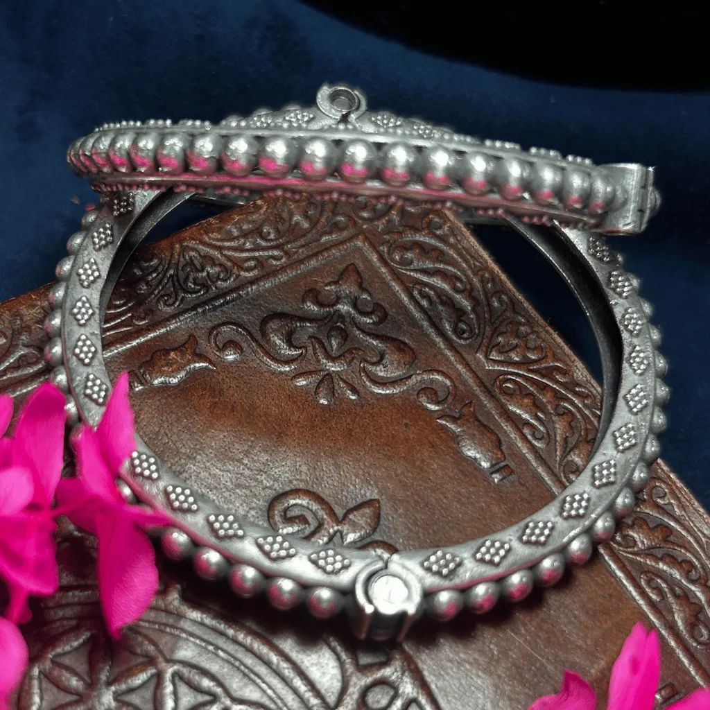 Embrace a timeless, rhythmic aesthetic with this pair of Oxidized Silver statement bangles. These pieces feature a striking, continuous row of high-relief spherical silver beads, set against a meticulously textured tribal base. Handcrafted with an emphasis on classic silhouettes, the design offers a perfect balance of bold structure and artisanal charm. These versatile bangles are an essential choice for festivals, casual ethnic wear, or for stacking with other kadas to create a personalized, bohemian-inspired statement.