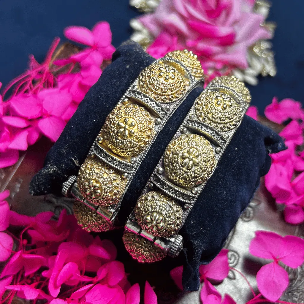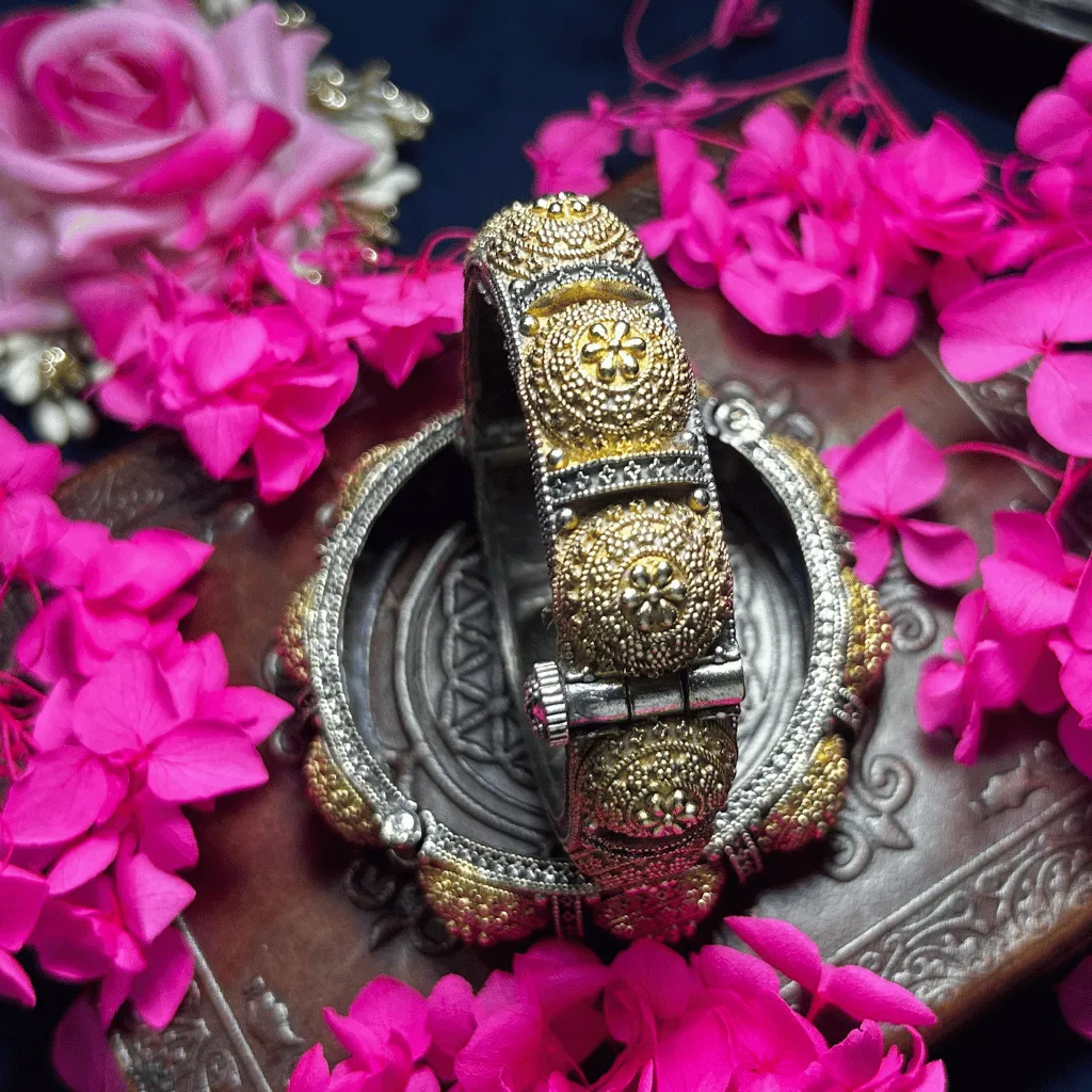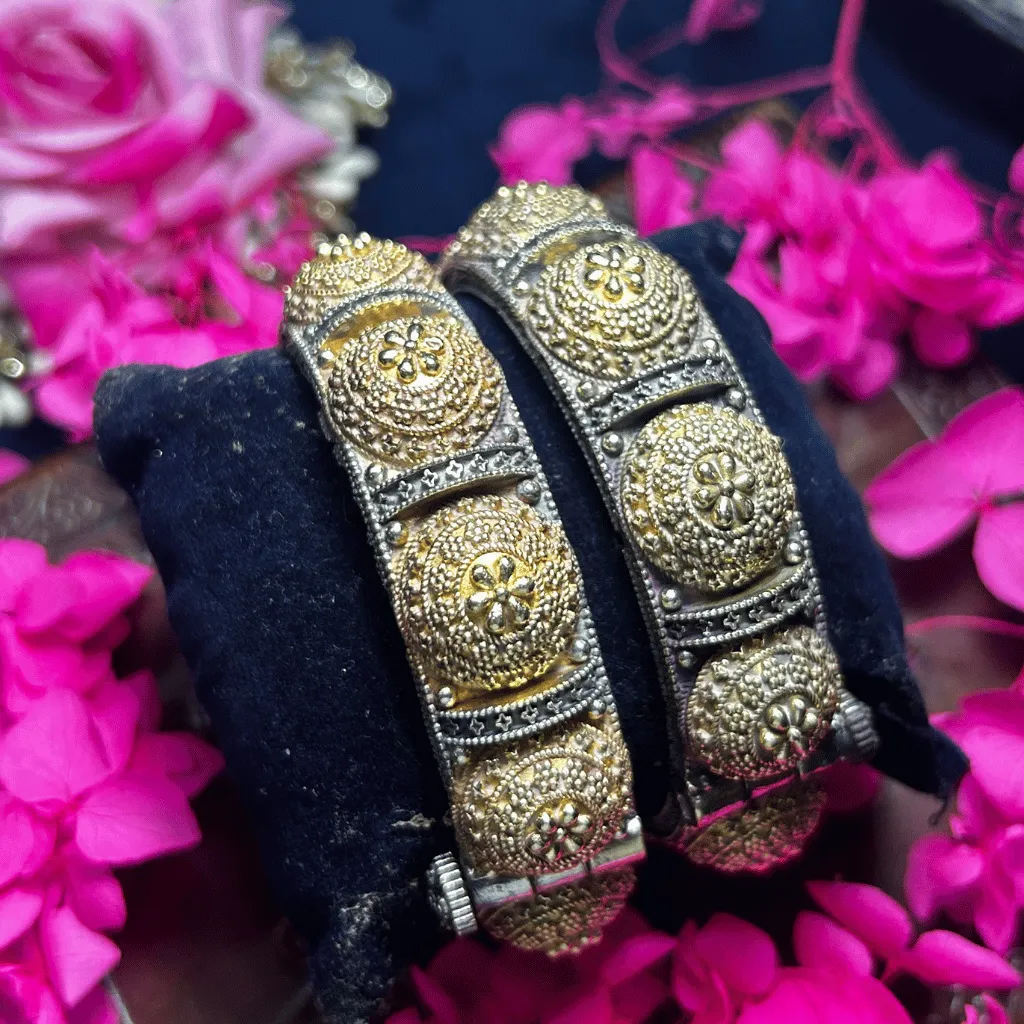 Illuminate your heritage collection with this pair of Two-Tone statement kadas. These bangles showcase a majestic sequence of high-relief sunburst medallions, each meticulously handcrafted with intricate floral centers and rhythmic beaded borders. The vibrant gold-toned medallions are set against a deeply textured, oxidized silver architectural base, creating a stunning high-contrast aesthetic. These bold kadas are a premier choice for festivals, weddings, or high-profile cultural events where you want to radiate timeless, queenly elegance.