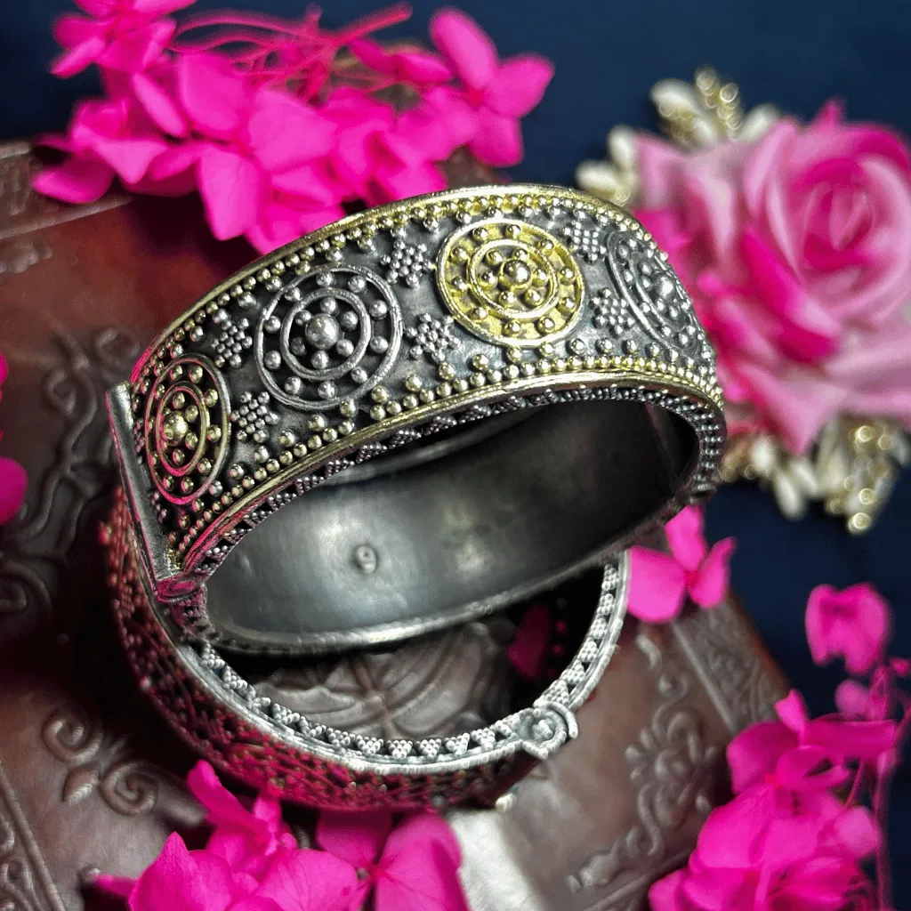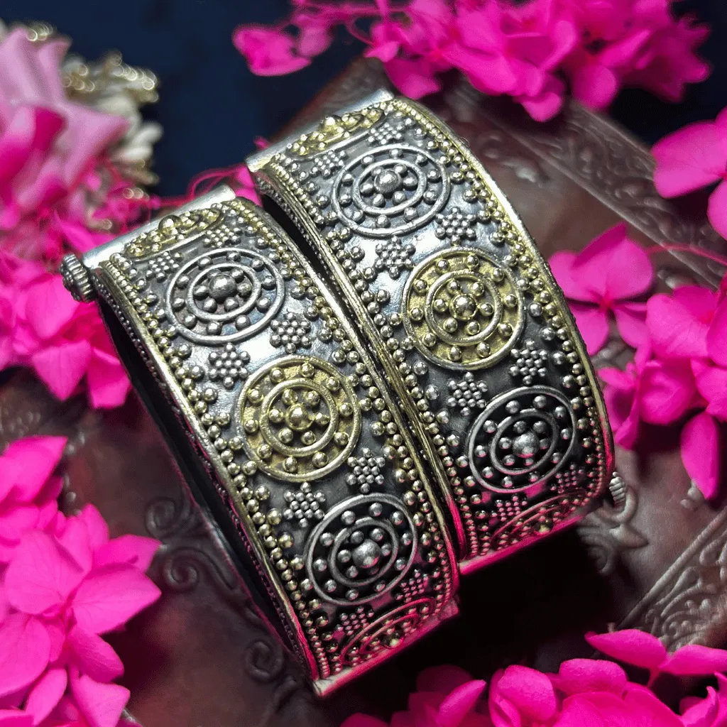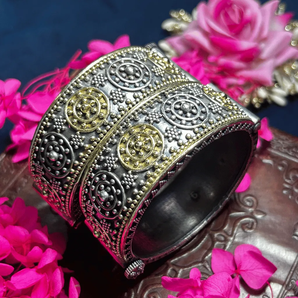 Embrace the bold spirit of heritage with this pair of Two-Tone statement kadas. These wide, architectural bangles feature a rhythmic sequence of high-relief mandala-style medallions, artfully alternating between oxidized silver and radiant gold-toned finishes. Handcrafted with meticulous detail, the design is further enriched by intricate beaded textures and traditional tribal motifs that create a sophisticated, multi-dimensional look. These kadas offer a regal, high-contrast presence that is perfect for festivals, weddings, or making a soulful cultural statement with your ethnic wardrobe.