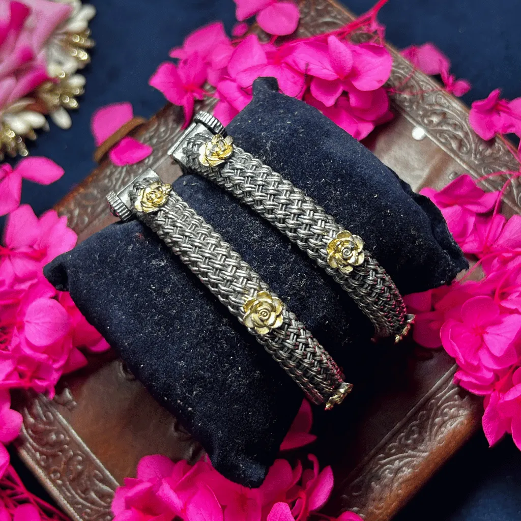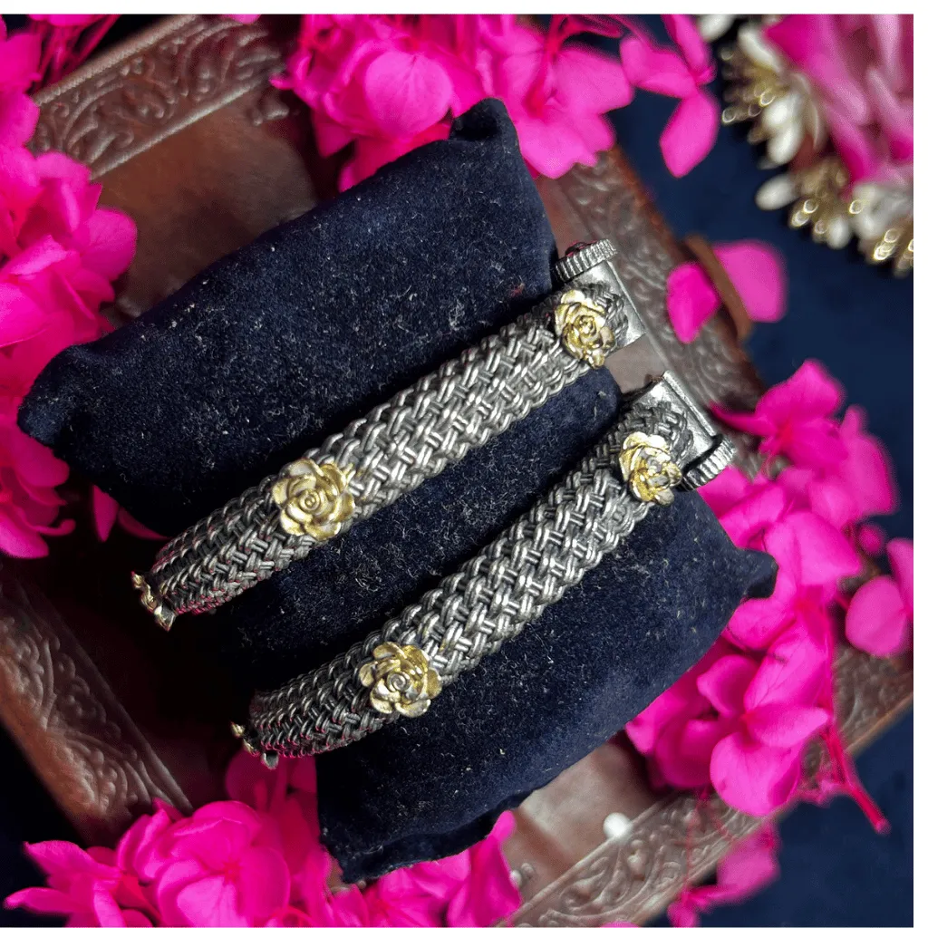 Discover the perfect harmony of texture and romance with this pair of Two-Tone statement bangles. These pieces feature a meticulously handcrafted basket-weave (chatai) metalwork band in deep oxidized silver, offering a rich, tactile architectural feel. The intricate weave is punctuated by radiant gold-toned rose motifs that bloom across the surface, creating a stunning high-contrast aesthetic. These slender kadas are exceptionally versatile, making them a premier choice for stacking with larger kadas, office ethnic wear, or adding a touch of artisanal charm to a contemporary fusion outfit.