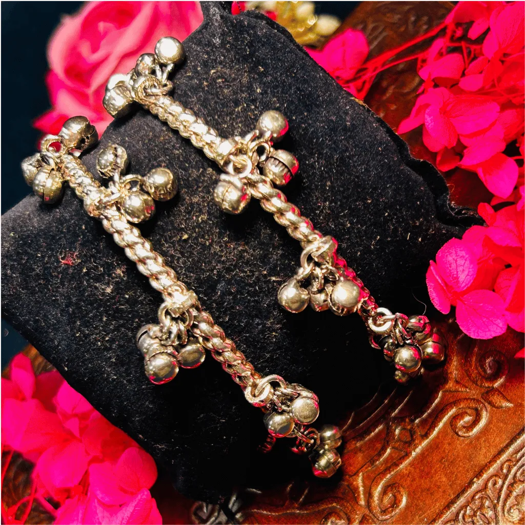 Celebrate the soulful rhythm of Indian tradition with this pair of Antique Oxidized Silver ghungroo bangles. Featuring a uniquely textured twisted-rope  band, these pieces are adorned with clusters of delicate silver ghungroos (dancing bells) that dangle at rhythmic intervals. Handcrafted with a focus on movement and charm, these bangles create a gentle, melodic chime with every gesture. Their bohemian, tribal-chic aesthetic makes them a perfect standout accessory for Navratri, festivals, or adding a touch of artisanal heritage to your everyday fusion wear.