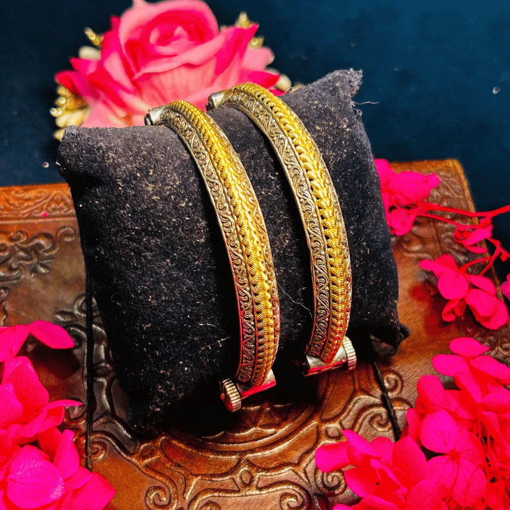 Elevate your everyday ethnic look with this pair of Two-Tone statement bangles. These pieces feature a sophisticated architectural profile, centered by a prominent, gold-toned braided ridge that runs along the spine of the bangle. This radiant central texture is flawlessly flanked by oxidized silver borders featuring intricate handcrafted floral scrollwork. The high-contrast finish between the warm gold and the deep, matte silver provides a timeless versatility, making these kadas a perfect choice for office ethnic wear, festive gatherings, or layering for a more dramatic tribal aesthetic.