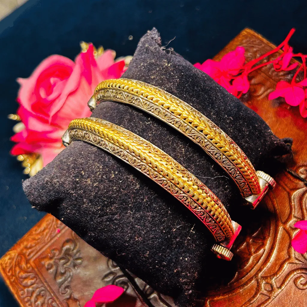 Elevate your everyday ethnic look with this pair of Two-Tone statement bangles. These pieces feature a sophisticated architectural profile, centered by a prominent, gold-toned braided ridge that runs along the spine of the bangle. This radiant central texture is flawlessly flanked by oxidized silver borders featuring intricate handcrafted floral scrollwork. The high-contrast finish between the warm gold and the deep, matte silver provides a timeless versatility, making these kadas a perfect choice for office ethnic wear, festive gatherings, or layering for a more dramatic tribal aesthetic.