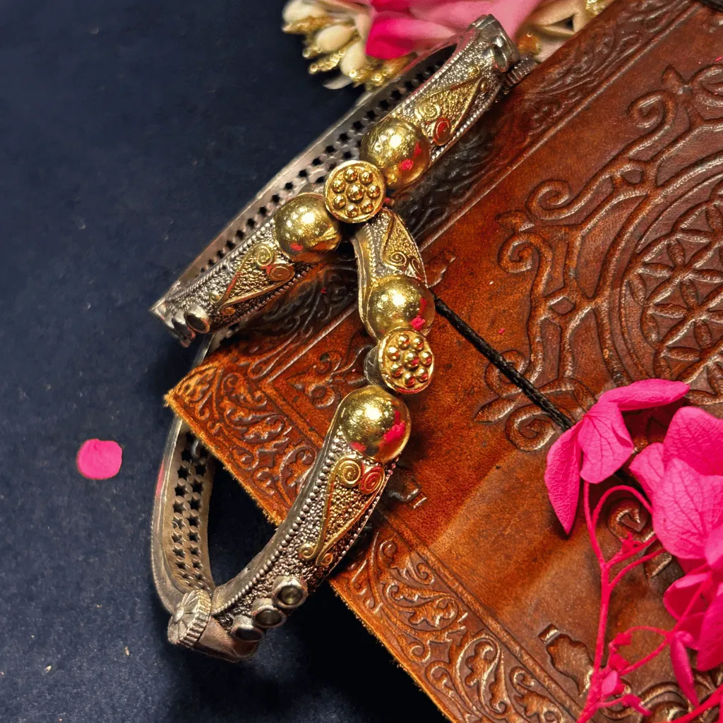 Achieve a perfect balance of bold structure and delicate symbolism with this pair of Two-Tone statement kadas. These bangles feature a striking architectural band of oxidized silver, punctuated by a series of high-relief gold-toned globes and intricate beaded medallions. Flowing between these focal points are exquisitely handcrafted heart and scroll motifs in a radiant gold finish, creating a magnificent multi-tonal contrast. These kadas offer a sophisticated, tribal-modern aesthetic that is a premier choice for festivals, fusion ethnic wear, or as a unique artisanal masterpiece for your heritage collection.