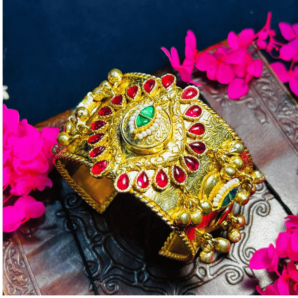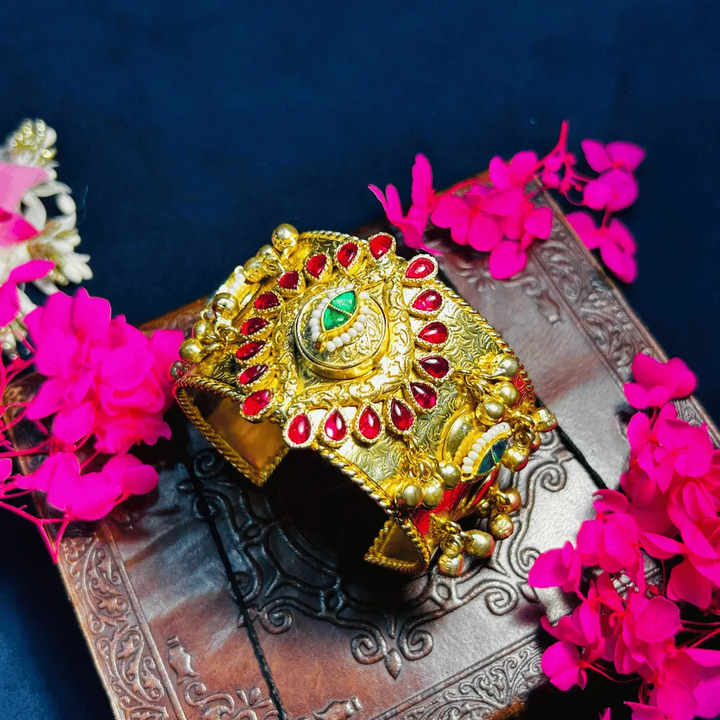 Command attention with this majestic Kashmiri Gold-Toned Statement Cuff. This broad, architectural bangle is a premier example of royal Kashmiri artistry, featuring an intricate tapestry of hand-engraved floral scrollwork. The centerpiece is a magnificent raised medallion set with a vibrant emerald-green stone, framed by a halo of delicate seed pearls and a radiant sunburst of ruby-red teardrop accents. Adorned with clusters of traditional ghungroos (dancing bells), this cuff creates a celebratory chime with every movement. It is a soulful, high-end masterpiece perfect for brides, weddings, or making a grand heritage statement at any festive occasion.