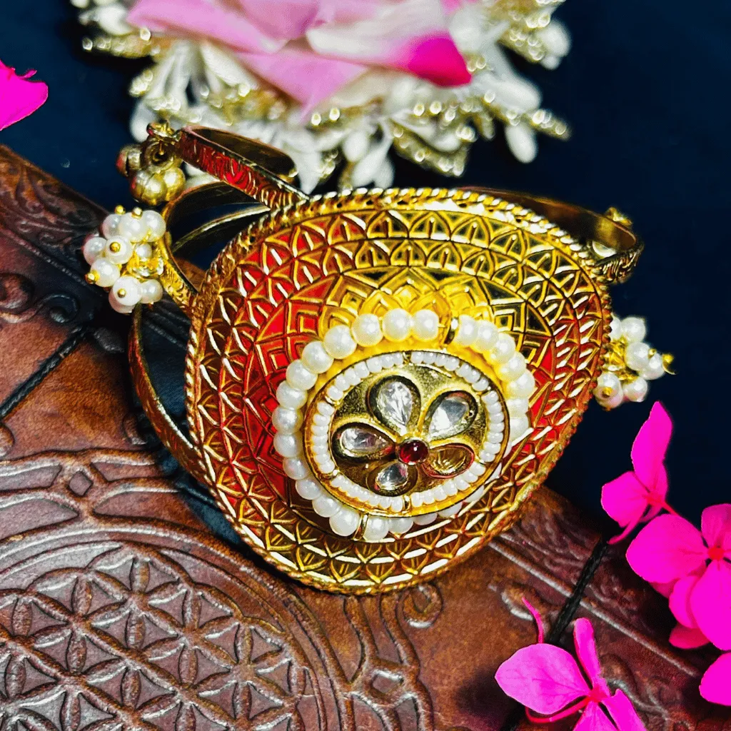 Exude royal elegance with this magnificent Kashmiri Gold-Toned statement cuff. This architectural masterpiece is handcrafted from premium German Silver and finished with a high-luster gold plating, ensuring a regal look with lasting durability. The broad, dome-shaped centerpiece features intricate filigree lattice work, crowned by a stunning Kundan Polki floral medallion framed in shimmering seed pearls. The open-cage triple-band design is accented with clusters of delicate pearl ghungroos, creating a soulful, celebratory chime with every gesture. This is a premier choice for brides, weddings, or making a grand heritage statement at any festive occasion.