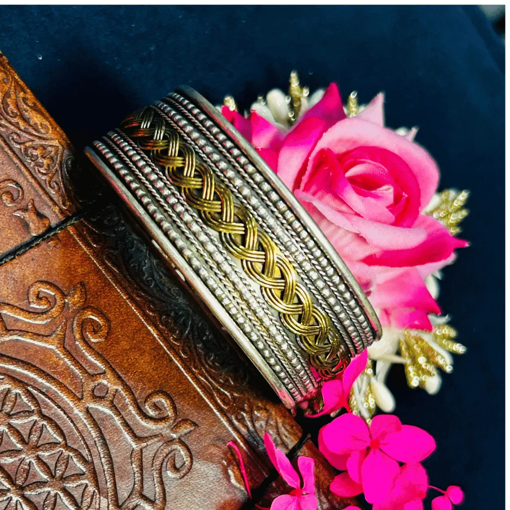 Embrace the rugged elegance of the valley with this German Silver two-tone cuff. Expertly handcrafted from premium German Silver, this wide-profile statement piece features a striking Ganga-Jamuna finish. The architectural band is defined by a central, high-relief gold-toned braided lattice, which is beautifully contrasted by tiered borders of oxidized silver beads and twisted-rope textures. This broad, open-style cuff offers a bold, tribal-chic aesthetic that is a premier choice for fusion wear, festivals, or adding a layer of authentic Kashmiri heritage to your contemporary wardrobe.