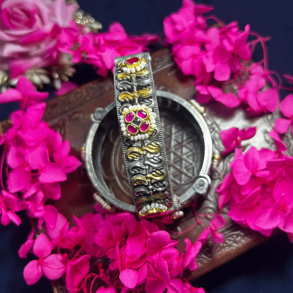 Embrace the rugged elegance of the valley with this German Silver two-tone cuff. Expertly handcrafted from premium German Silver, this wide-profile statement piece features a striking Ganga-Jamuna finish. The architectural band is defined by a central, high-relief gold-toned braided lattice, which is beautifully contrasted by tiered borders of oxidized silver beads and twisted-rope textures. This broad, open-style cuff offers a bold, tribal-chic aesthetic that is a premier choice for fusion wear, festivals, or adding a layer of authentic Kashmiri heritage to your contemporary wardrobe.