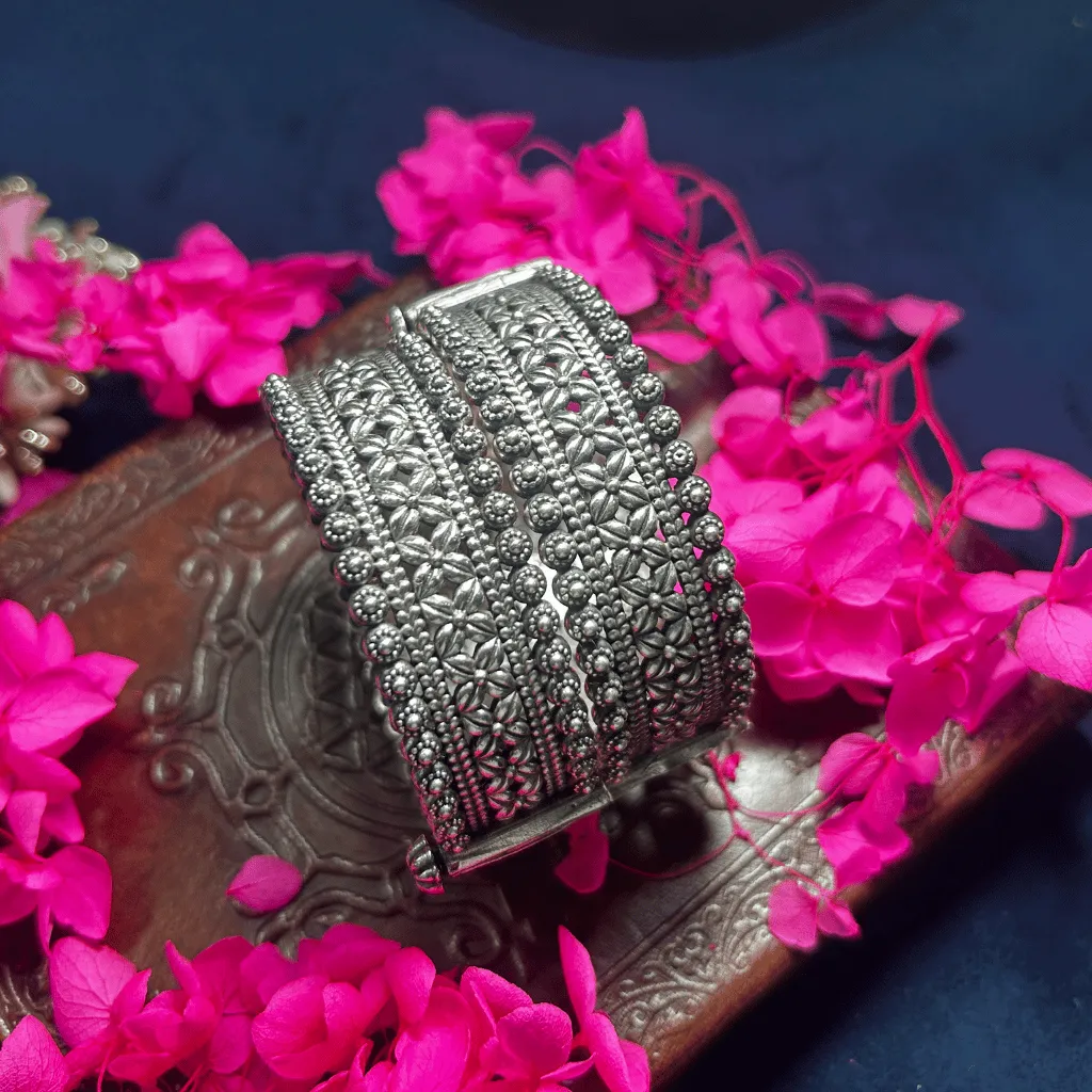 Command the spotlight with this majestic German Silver statement cuff. A pinnacle of traditional metalwork, this wide architectural piece is handcrafted from premium German Silver and finished with a refined antique oxidized patina. The centerpiece is a large, hand-engraved floral medallion featuring a blooming lotus motif, a classic symbol of beauty in the valley. This central disc is elegantly framed by a halo of shimmering white seed pearls, adding a soft, royal luster to the robust tribal design. Perfect for weddings, festive receptions, or for the woman who seeks a powerful heirloom masterpiece for her collection.