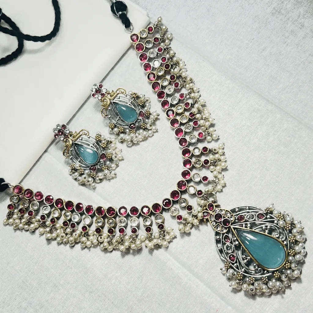 Embody the essence of high-fashion ethnic grace with this German Silver Statement Choker and Earring set. This architectural masterpiece features a wide, intricate choker band detailed with rhythmic stone-set patterns and a tiered fringe of shimmering white pearls. The focal point is a grand, teardrop-shaped pendant showcasing a serene turquoise-blue cabochon, framed by delicate silver filigree and a celebratory halo of seed pearls.