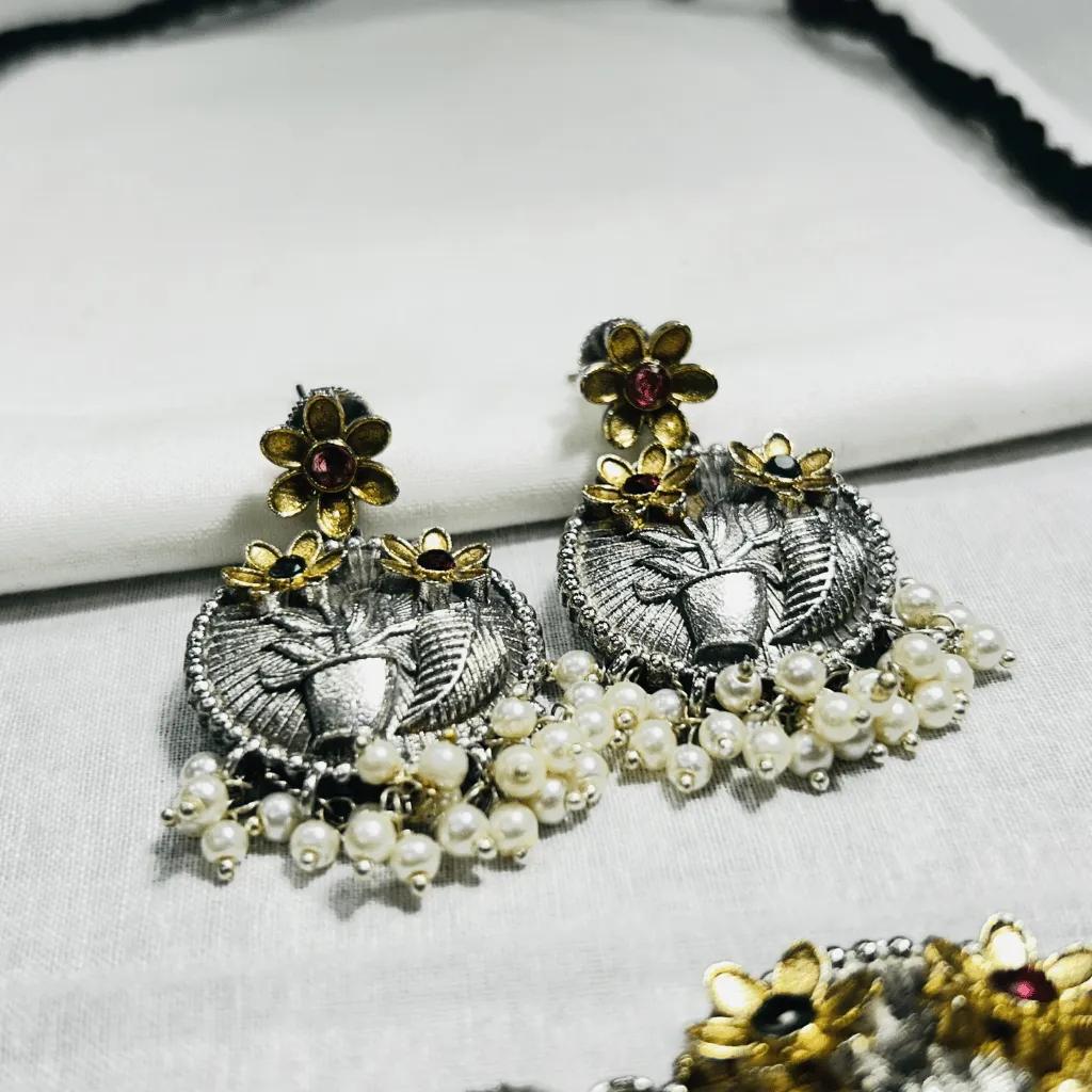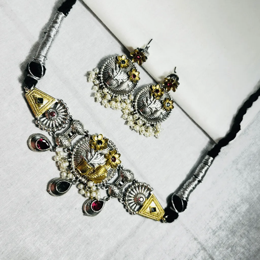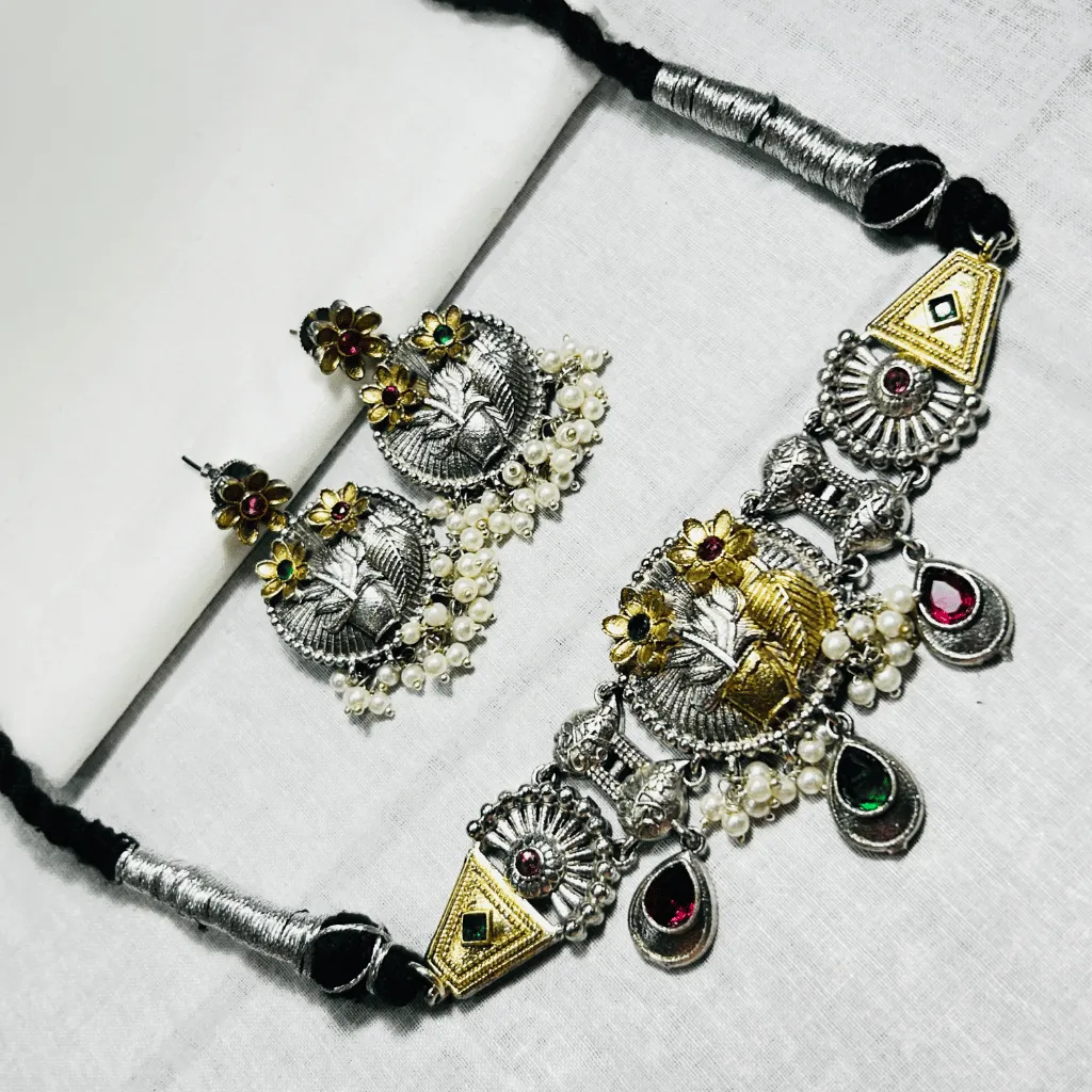 Infuse your jewelry collection with the artistic soul of this German Silver Statement Necklace and Earring set. Featuring a stunning “Ganga-Jamuna” dual-tone finish, this architectural piece centers around a magnificent, circular medallion adorned with handcrafted gold-toned floral and plant motifs. The design is flanked by geometric triangular panels and rhythmic sunburst etchings, creating a harmonious blend of tribal and heritage aesthetics.