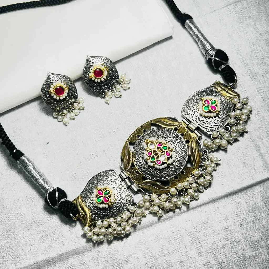 Embrace the grandeur of heritage with this German Silver Statement Choker and Earring set. This architectural masterpiece features a massive, circular central medallion framed by two broad, leaf-shaped panels in a high-contrast “Ganga-Jamuna” dual-tone finish. Each panel is meticulously handcrafted with intricate floral etchings and accented by a vibrant palette of ruby-red and emerald-green stones.