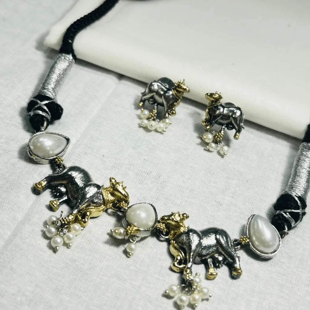 Celebrate the sacred beauty of tradition with this German Silver Cow Motif Necklace and Earring set. A soulful addition to your jewelry collection, this piece features the iconic Kamdhenu (sacred cow) motif, expertly handcrafted with a dual-toned “Ganga-Jamuna” finish. The oxidized silver bodies of the figurines are beautifully contrasted by delicate gold-toned detailing on the heads and bells.