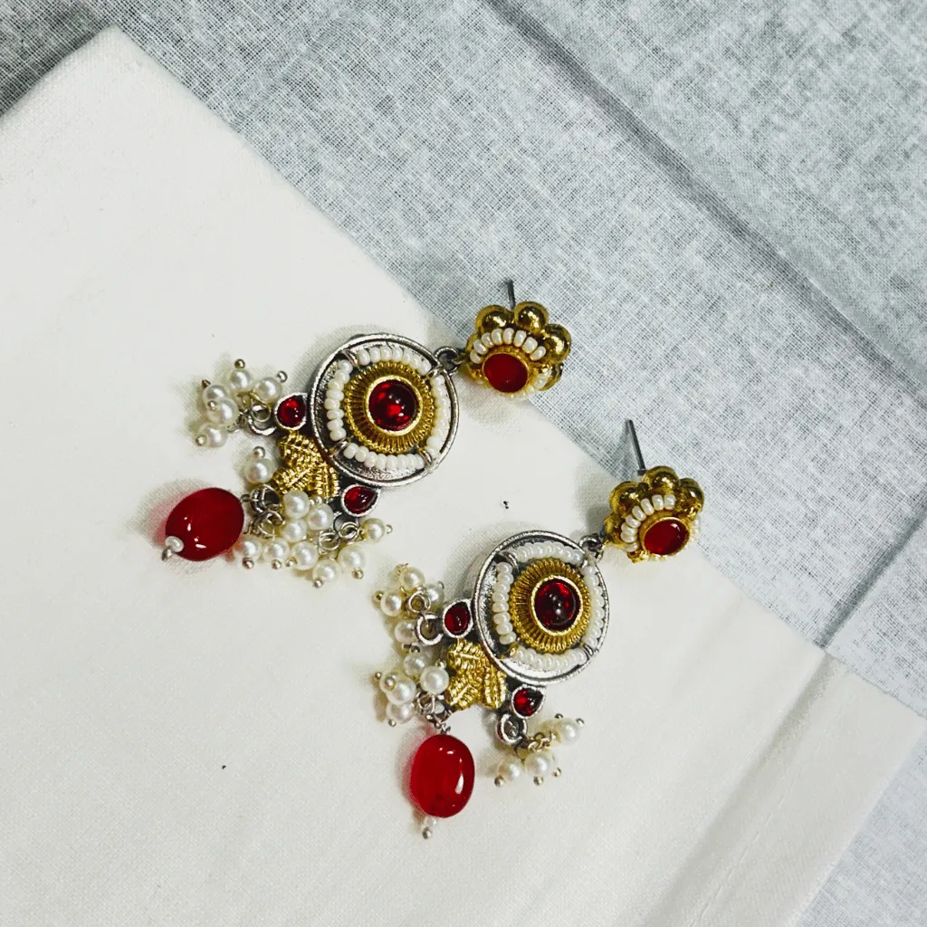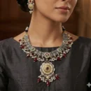 Handcrafted from premium German Silver with a refined antique patina, the necklace is brought to life with a celebratory fringe of ruby-toned beads and shimmering white seed pearls. Secured with an adjustable black thread dori, this set offers a majestic “white metal” luster and a premium weight, making it a premier choice for weddings, festive galas, or for making a grand statement with a silk saree.