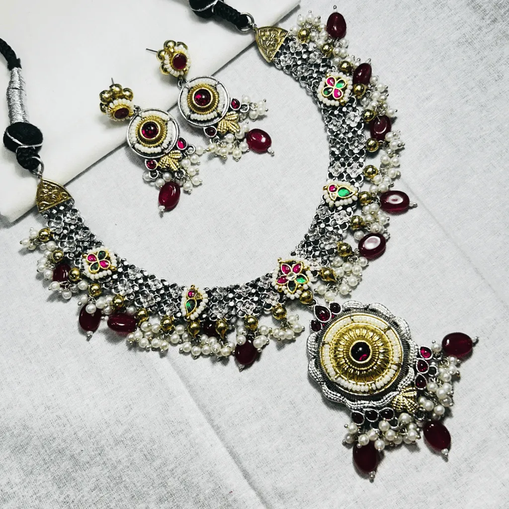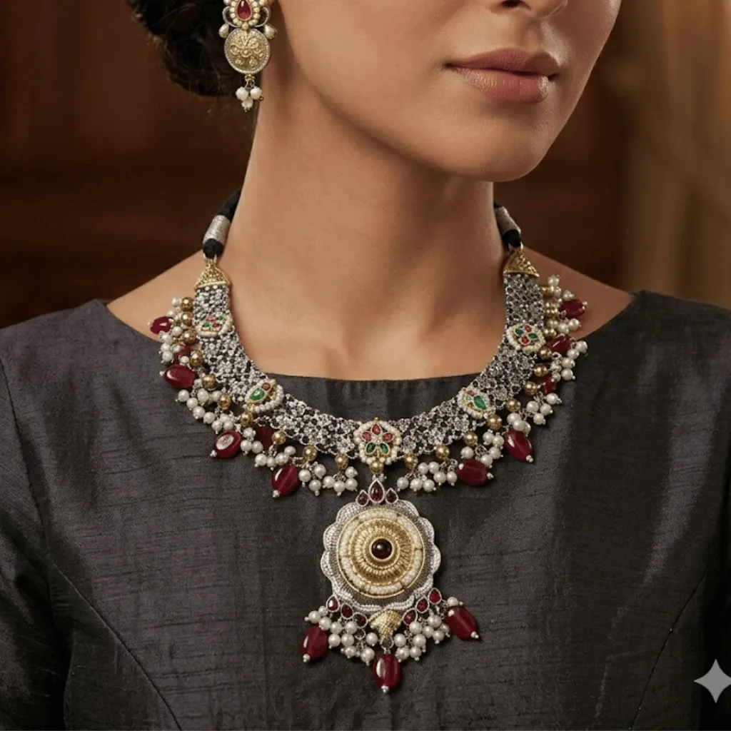 Exude timeless elegance with this German Silver Statement Choker and Earring set. A masterclass in artisanal metalwork, this piece features a wide, textured choker band intricately detailed with rhythmic silver patterns and vibrant ruby and emerald-toned stone accents. The centerpiece is a magnificent, circular sunburst medallion in a high-contrast gold and silver finish, framed by a delicate halo of pearls.