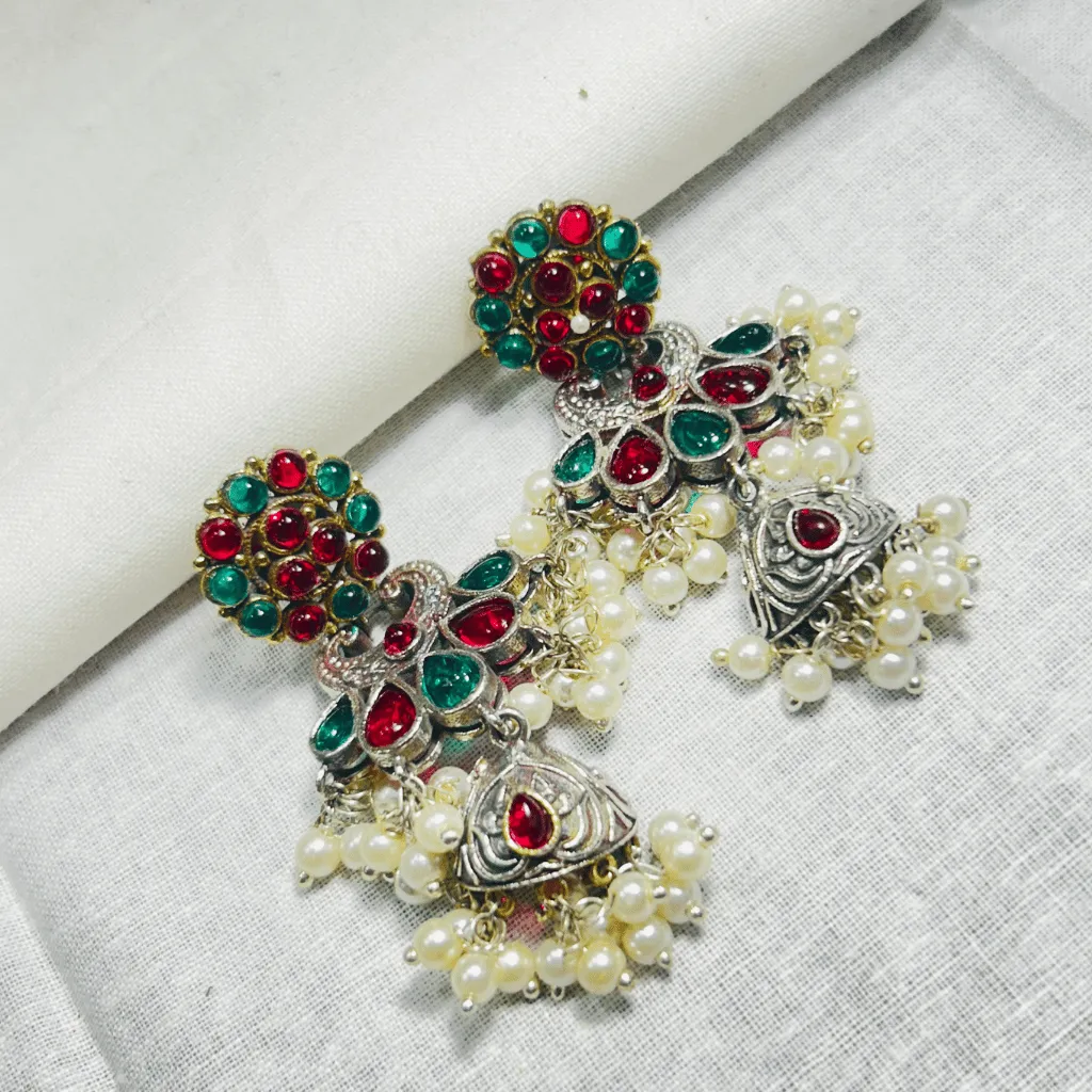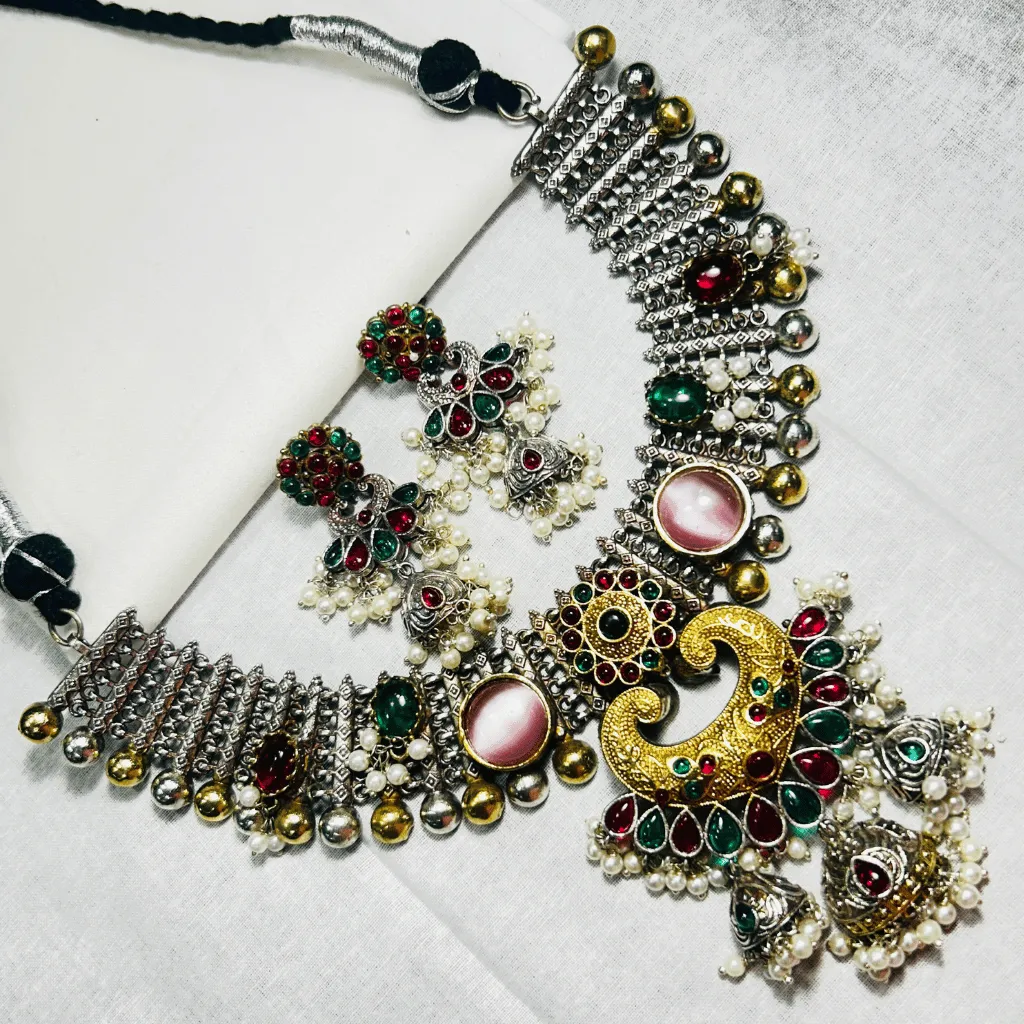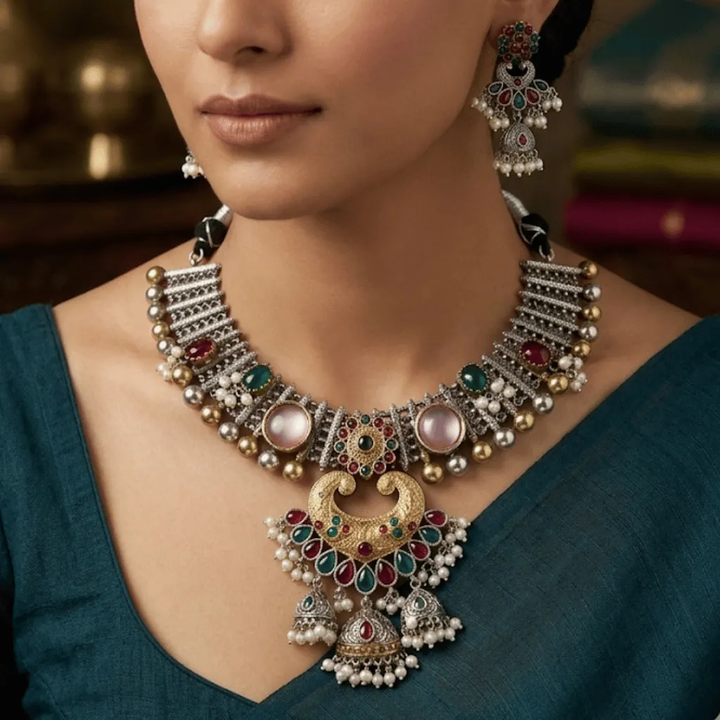 Handcrafted from premium German Silver with a refined antique patina, the pendant transitions into a spectacular tiered fringe of ruby and emerald-toned teardrops and three dangling miniature jhumkas finished with delicate white pearls. This high-jewelry statement set offers a majestic weight and a soulful heritage feel, making it a premier choice for weddings, festive galas, or for the woman who carries the spirit of royalty in her style.