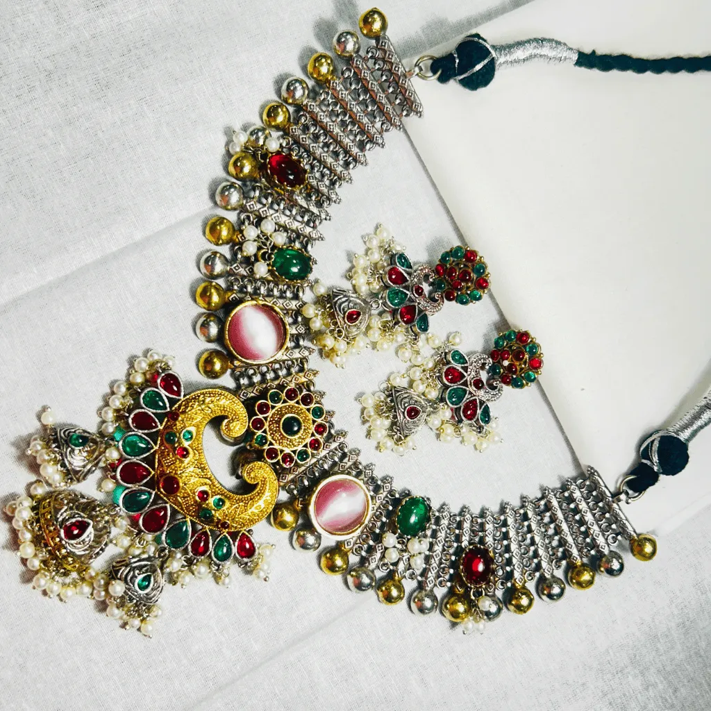 Exude regal charm with this German Silver Grand Statement Necklace and Earring set. A pinnacle of architectural jewelry design, this wide-profile piece features a heavy, multi-layered band detailed with rhythmic silver panels and polished metallic beads. The focal point is a magnificent gold-toned crescent moon (Chandbali) centerpiece, intricately engraved and flanked by soft pink cabochon stones.