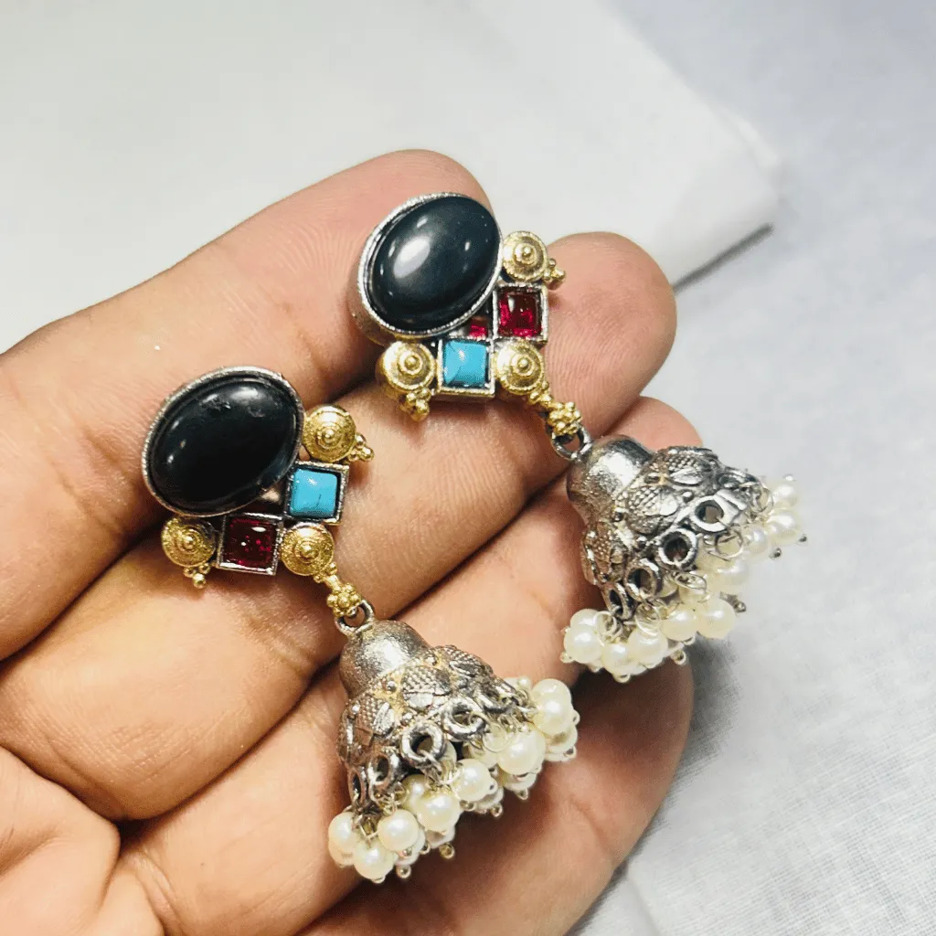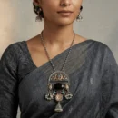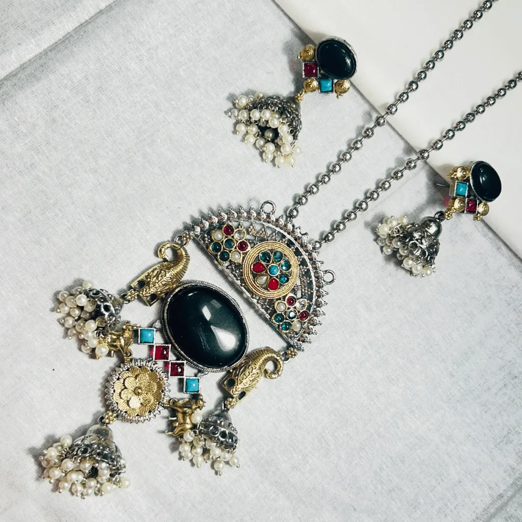 Embrace a bold, tribal-inspired aesthetic with this German Silver Long Necklace and Jhumka Earring set. Handcrafted from high-grade German Silver, this architectural statement piece features a massive multi-tiered pendant designed for maximum impact. The central focus is a large, polished black onyx-style stone, flanked by gold-toned bird motifs and intricate filigree patterns. The design is further elevated with multi-colored enamel accents and dangling miniature jhumkas finished with delicate white pearls. This long Haar set offers a sophisticated antique luster and a premium weight, making it an essential masterpiece for festivals, receptions, or paired with a classic handloom saree