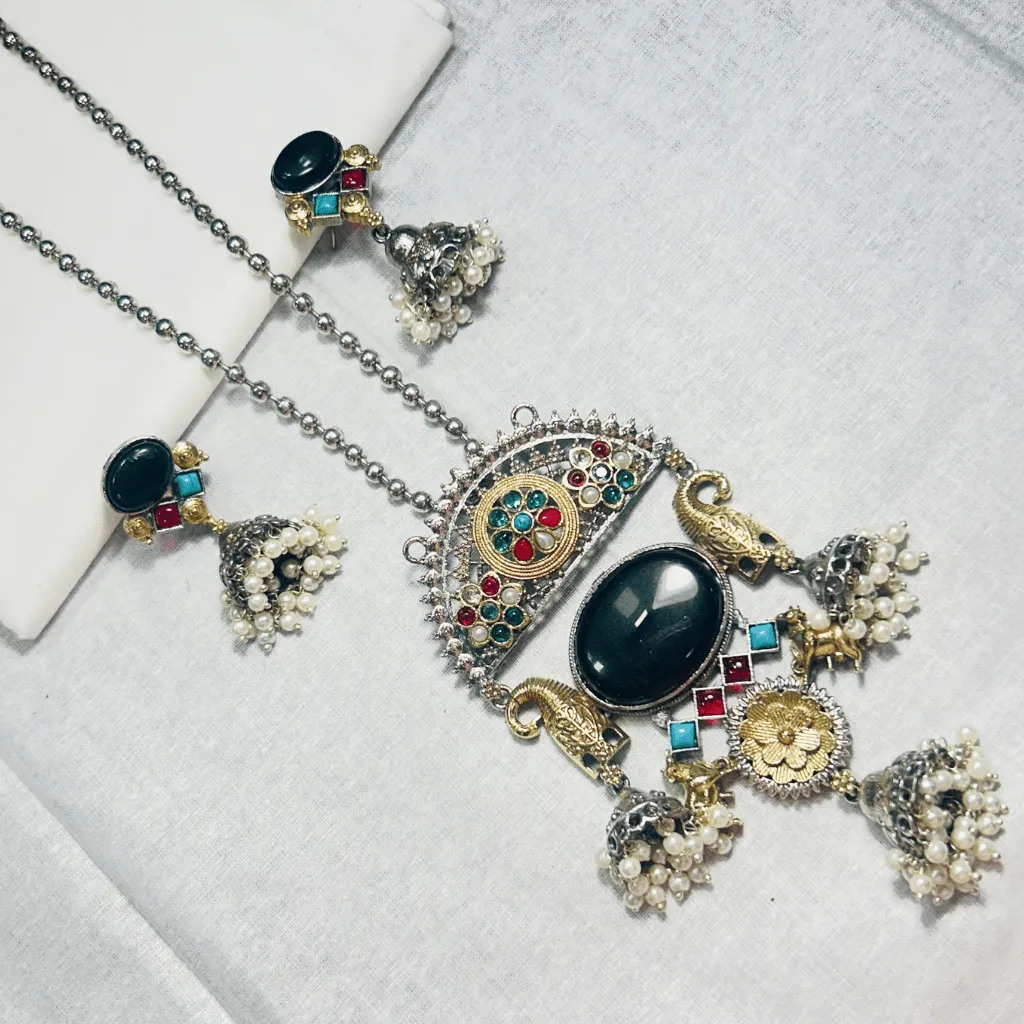 Embrace a bold, tribal-inspired aesthetic with this German Silver Long Necklace and Jhumka Earring set. Handcrafted from high-grade German Silver, this architectural statement piece features a massive multi-tiered pendant designed for maximum impact. The central focus is a large, polished black onyx-style stone, flanked by gold-toned bird motifs and intricate filigree patterns. The design is further elevated with multi-colored enamel accents and dangling miniature jhumkas finished with delicate white pearls. This long Haar set offers a sophisticated antique luster and a premium weight, making it an essential masterpiece for festivals, receptions, or paired with a classic handloom saree