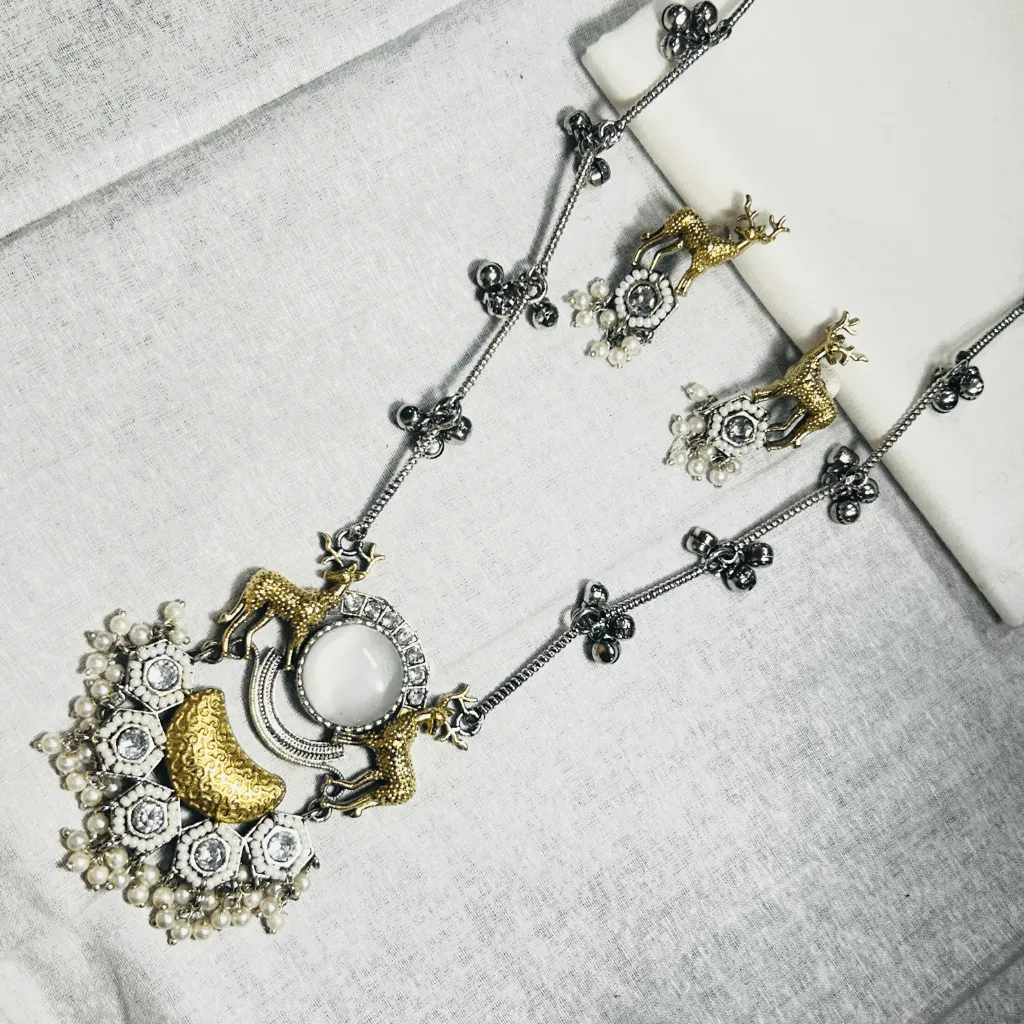 Achieve a look of regal sophistication with this German Silver Long Necklace and Earring set, defined by its classic two-color palette of deep emerald green and pristine white. This architectural masterpiece is handcrafted from premium German Silver and features a striking tiered pendant. The design is centered around a translucent emerald-green cabochon, framed by a matching halo of green stones and anchored by a textured gold-toned crescent.