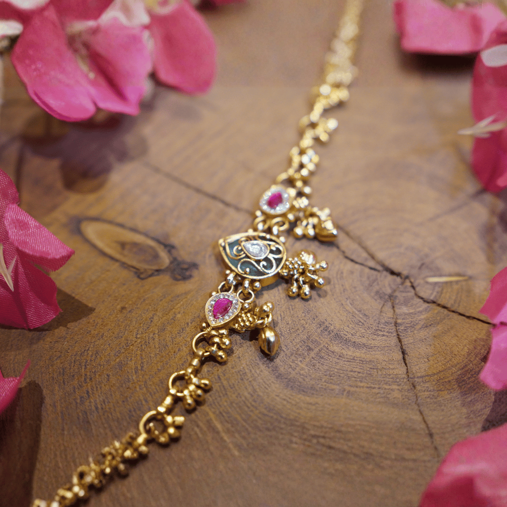 Inspired by timeless heritage artistry, this minimal brass bracelet features delicate dangle charms and intricate motifs for a graceful festive look. Lightweight and versatile, it beautifully complements ethnic outfits, festive stacking, and refined traditional styling
