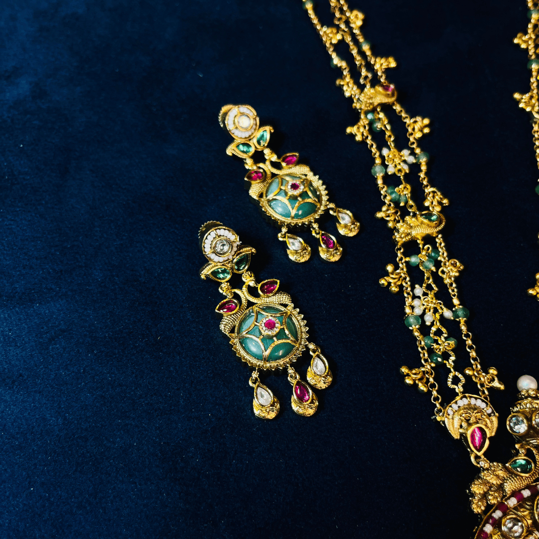 Embrace the grandeur of South Indian heritage with this magnificent Antique Gold Guttapusalu-style Long Haram. The centerpiece is a majestic, multi-tiered pendant featuring a central emerald-green sunburst motif, accented by rich ruby-red stones and shimmering uncut gems. The triple-layered long chain is handcrafted with intricate gold links and delicate green bead spacers, leading to a sea of cascading pearl clusters and gold bead droplets. This regal masterpiece is designed for weddings, grand engagements, and traditional festive celebrations, offering an unmatched queenly silhouette.