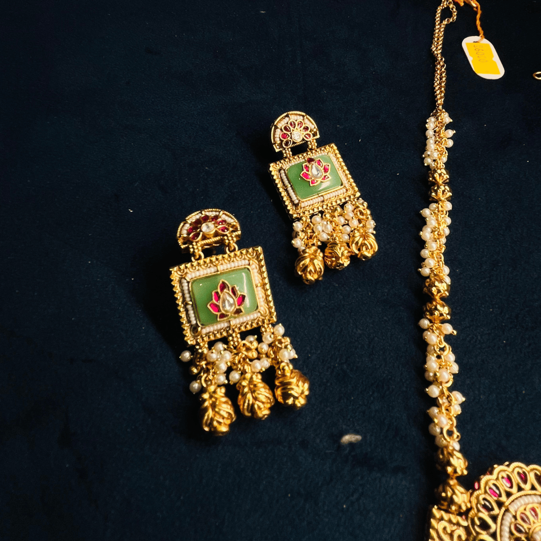 Embrace divine elegance with this Antique Gold Long Haram, a masterpiece of traditional Temple artistry. The centerpiece features a grand rectangular pendant with intricate floral filigree, centered around a stunning sage green Meenakari lotus. This regal piece is accented with ruby-red stones and finished with a rich fringe of gold bead droplets and seed pearls. The handcrafted chain, featuring delicate pearl bunching, offers a sophisticated heritage look perfect for weddings, grand engagements, or traditional festive celebrations.