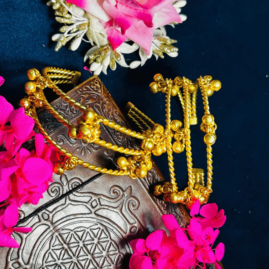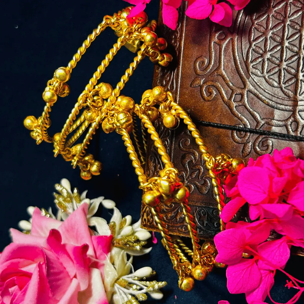 Capture the melodic essence of the valley with this pair of Kashmiri Gold-Toned ghungroo bangles. These exquisite pieces feature the traditional Kashmiri twisted-rope (moti-work) band, meticulously handcrafted to achieve a rich, rope-like texture. The design is celebrated for its rhythmic clusters of delicate gold-toned ghungroos (dancing bells) that chime softly with every movement. These bangles embody the soulful artistry of Kashmiri heritage, offering a bohemian-luxe aesthetic that is perfect for weddings, festive celebrations, or as a unique artisanal statement in your ethnic collection.