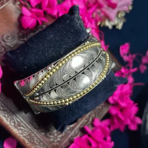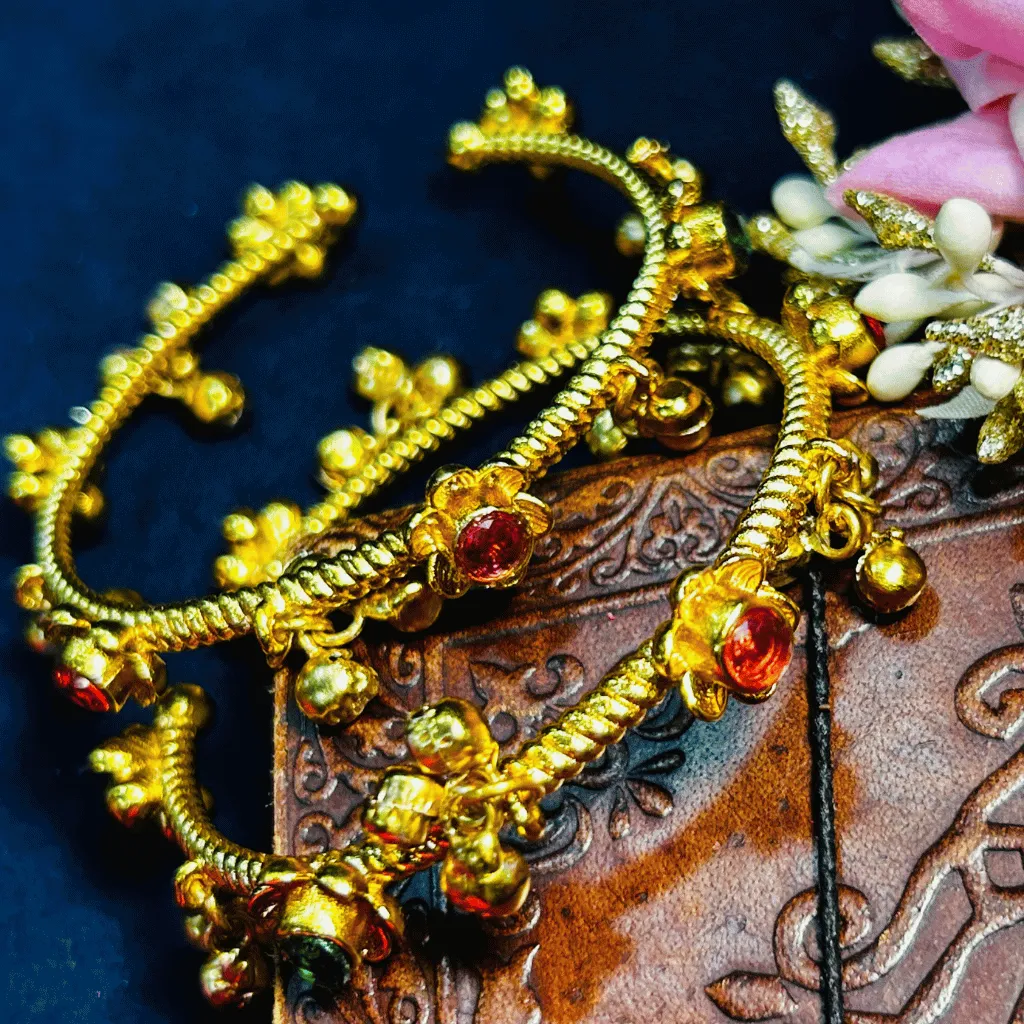 Bring the vibrant artistry of the valley to your jewelry box with this pair of Kashmiri Gold-Toned floral bangles. These pieces are a masterclass in regional craftsmanship, featuring a textured twisted-rope (moti-work) band typical of traditional Kashmiri designs. The architectural profile is beautifully punctuated by handcrafted floral charms set with radiant ruby-red and emerald-green stones. Adding to their soulful charm are clusters of delicate gold-toned ghungroos (dancing bells) that create a melodic chime with every gesture. These bangles are a premier choice for weddings, festivals, or adding a touch of authentic Kashmiri heritage to your ethnic collection.