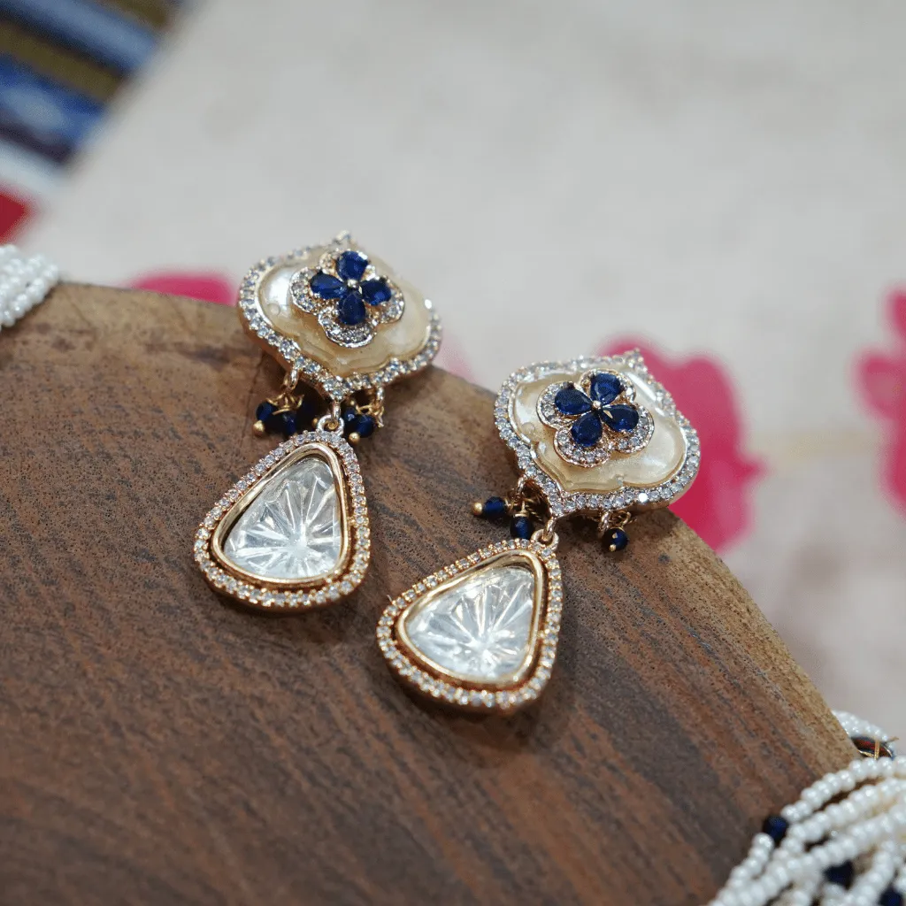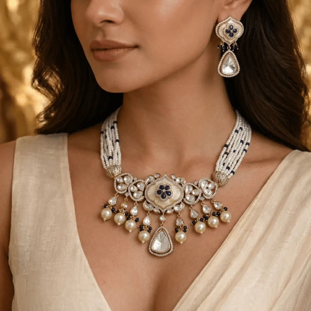Experience the unparalleled brilliance of Moissanite Polki with this exquisite heritage choker. This masterpiece features a central Meenakari floral motif in ivory and deep blue, surrounded by high-luster Moissanite stones that capture the light with diamond-like fire. The multi-layer seed pearl strands and cascading pearl droplets add a layer of timeless sophistication. Handcrafted for a grand, artisanal finish, this jewelry set is the ultimate statement piece for weddings, grand engagements, or high-end festive celebrations.