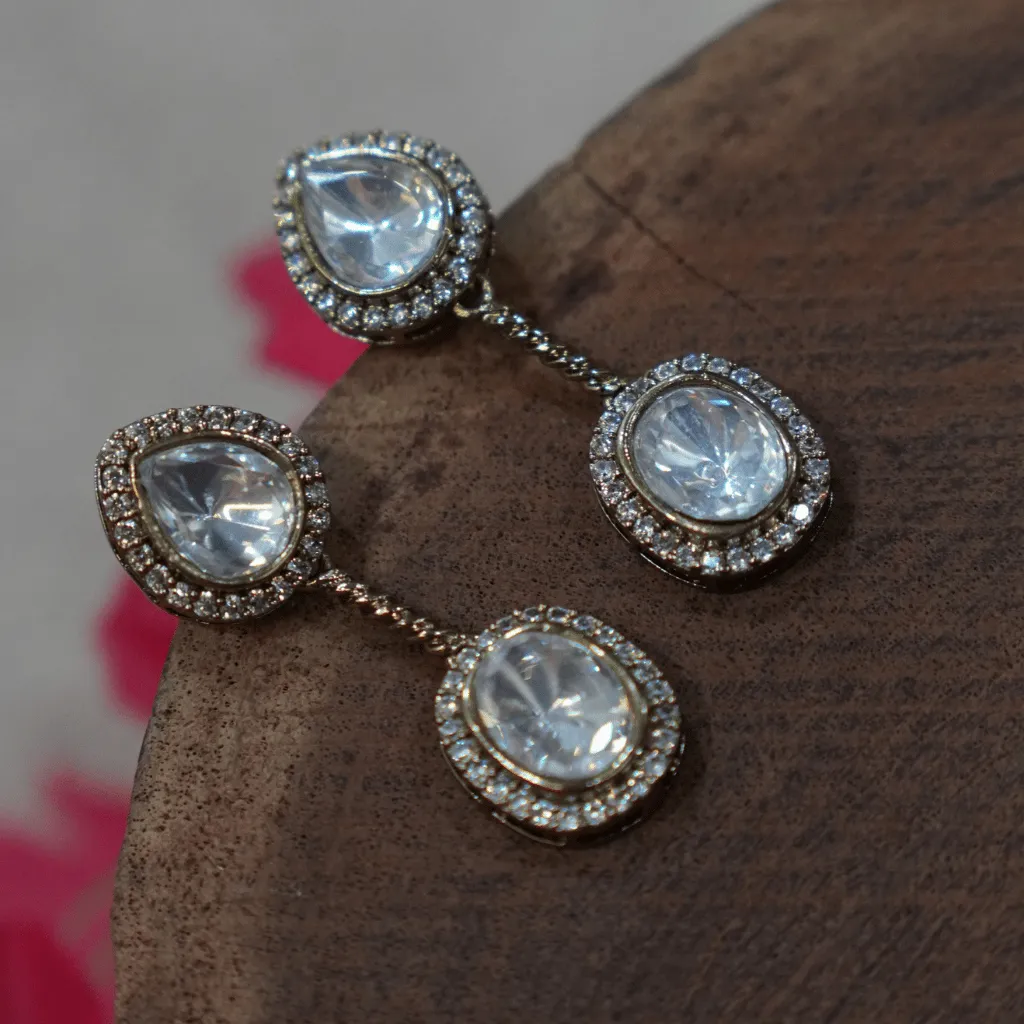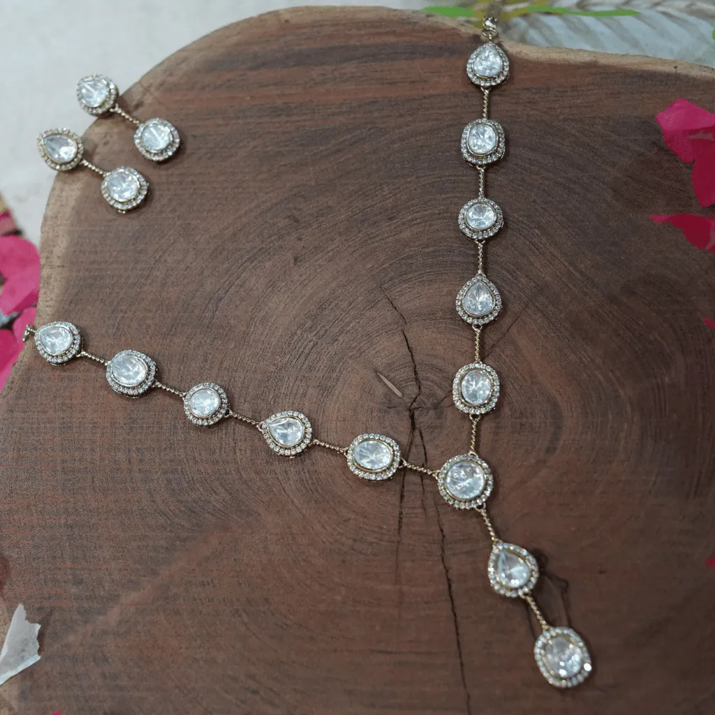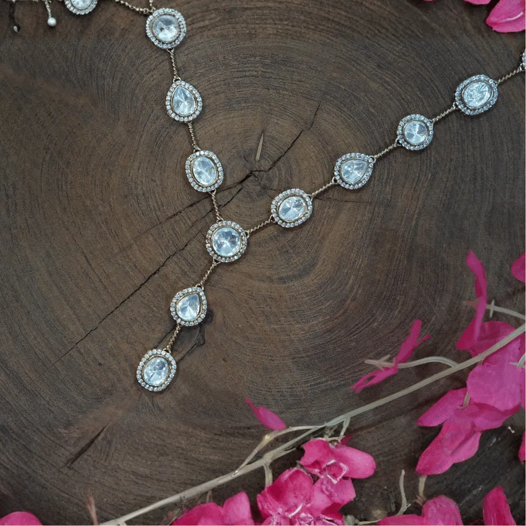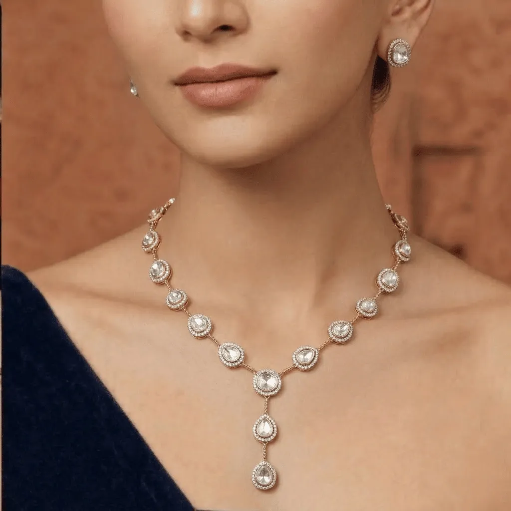 Achieve a look of effortless radiance with this Moissanite Polki necklace. Featuring a graceful Y-silhouette with delicate pear-shaped drops, this set offers a minimalist and modern take on classic uncut stone jewelry. Expertly handcrafted for a lightweight feel, it provides a seamless transition from a high-glamour wedding to a sophisticated engagement celebration.