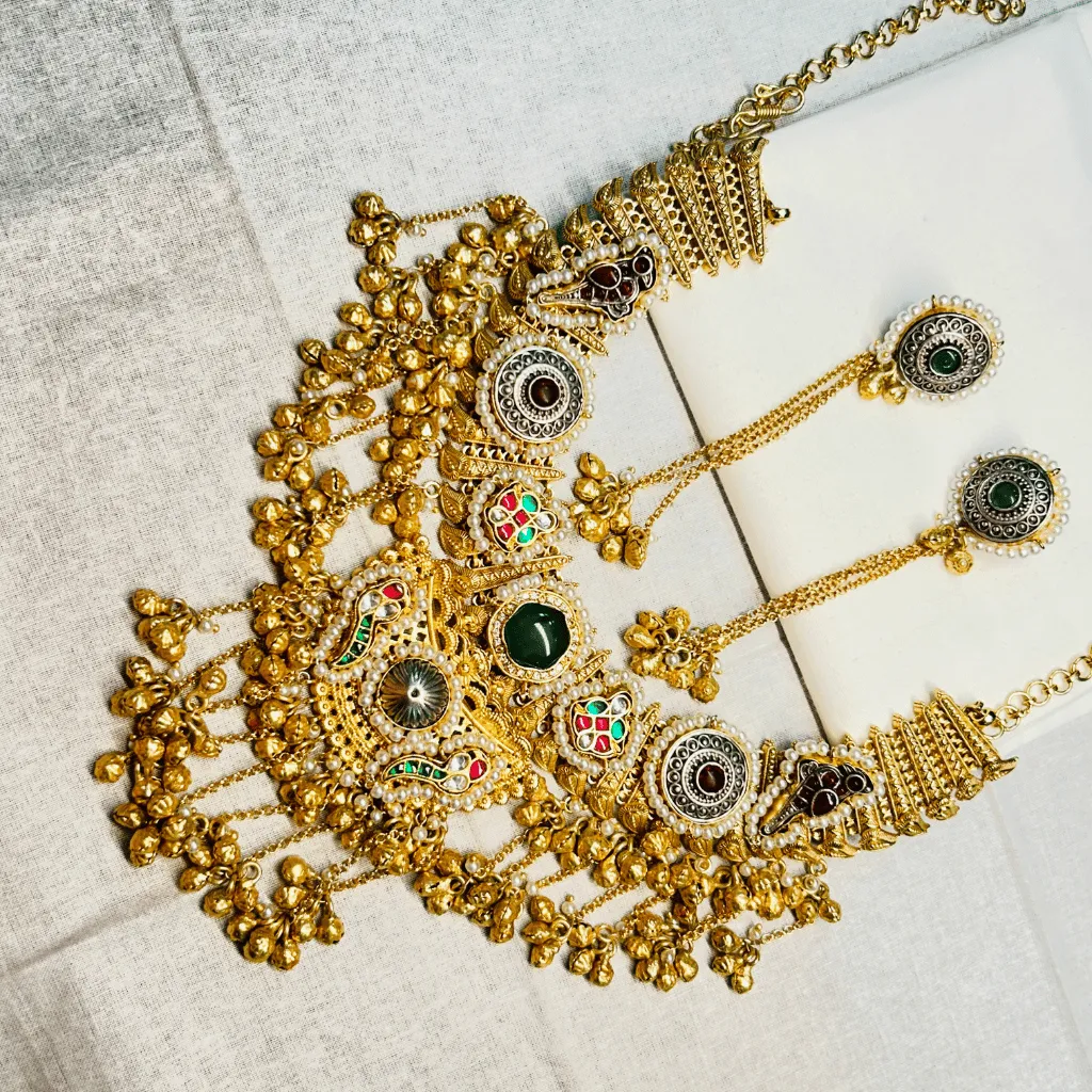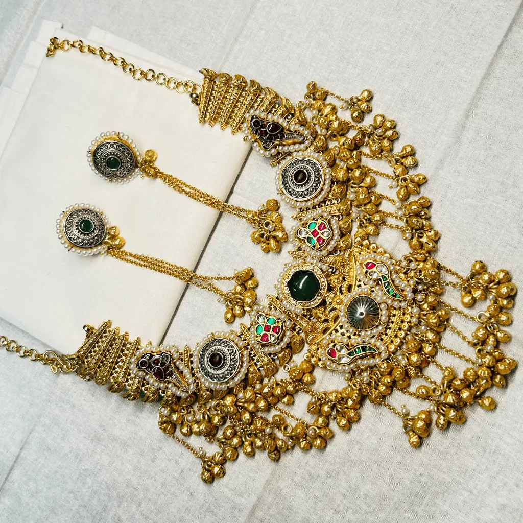Step into a legacy of royal splendor with the Vaidehi Grand Collar. A true masterpiece of temple-fusion artistry, this set is designed for the woman who seeks a commanding presence. Featuring a grand, multi-tiered silhouette that gracefully contours the neckline, it combines the warmth of antique gold with the vintage soul of oxidised silver.