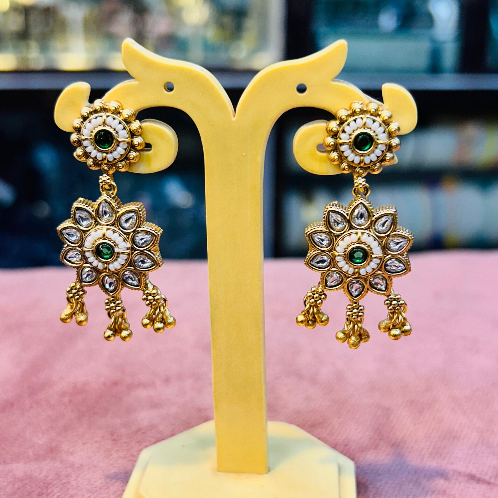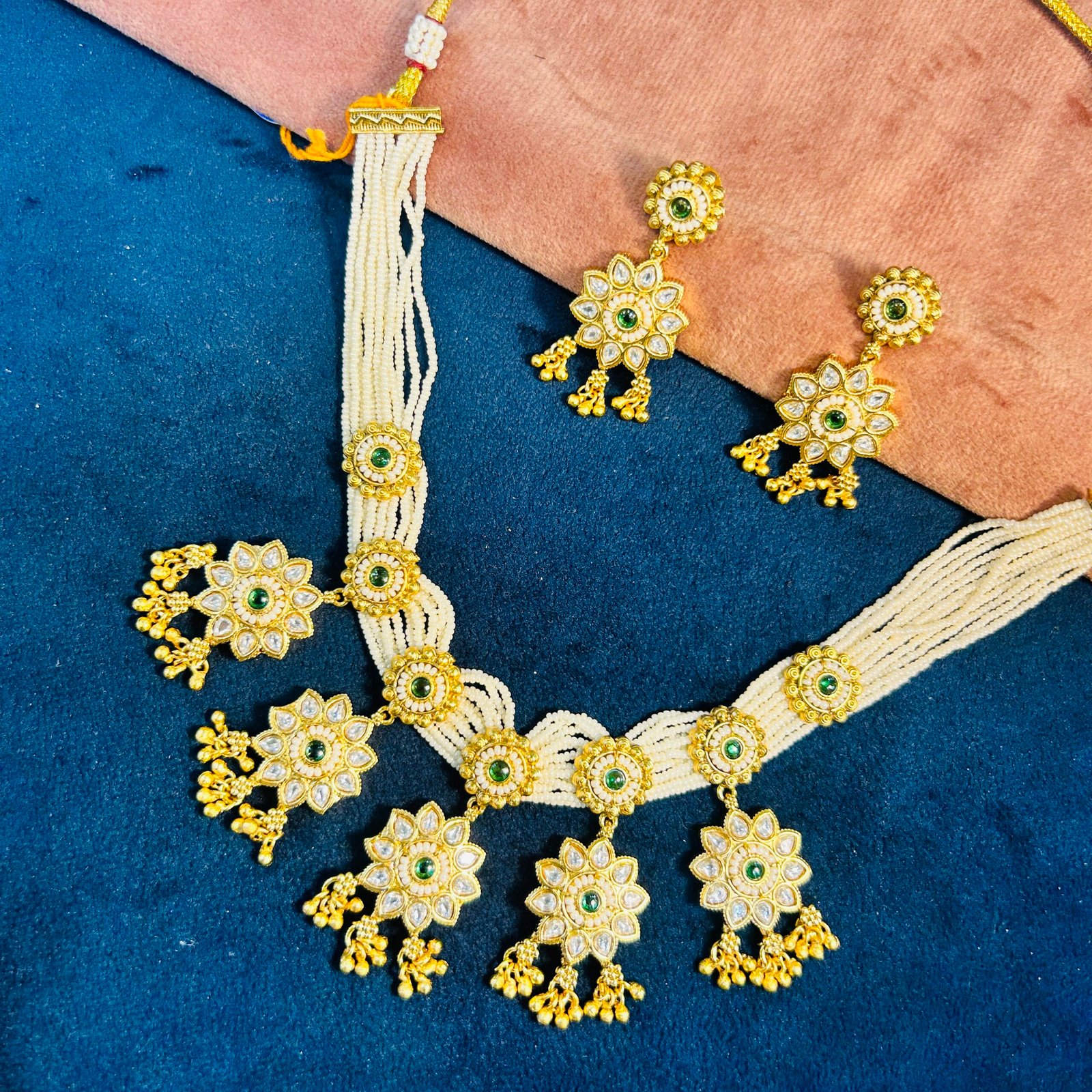 Radiate vintage charm with this exquisite Antique Gold Kundan choker set. This masterpiece features a series of majestic floral sunburst motifs adorned with shimmering uncut stones and vibrant emerald-green centers. Suspended from multiple layers of fine seed pearl strands (Moti), the design is finished with a rhythmic fringe of gold bead droplets that capture every movement. Handcrafted for a grand heritage look, this set is an exceptional choice for weddings, grand engagements, or traditional festive celebrations.