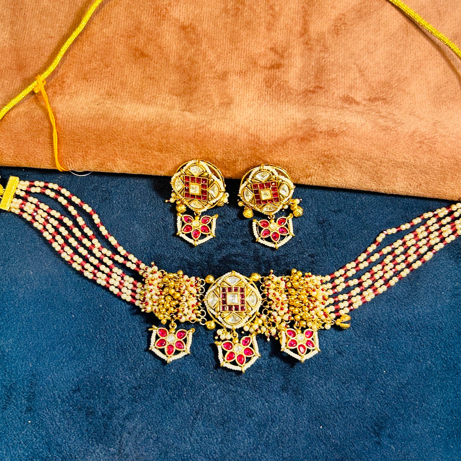 Channel timeless royal grace with this Antique Gold Polki Moti choker, featuring a magnificent blend of heritage artistry and modern elegance. The centerpiece is adorned with intricate Kundan-style Polki work and vibrant ruby-red floral motifs, framed by rich gold bead accents. Set on multiple strands of fine seed pearls (Moti), this handcrafted masterpiece offers a grand traditional look with a comfortable minimalist fit. It is the ultimate statement set for weddings, festive celebrations, or a classic engagement ensemble