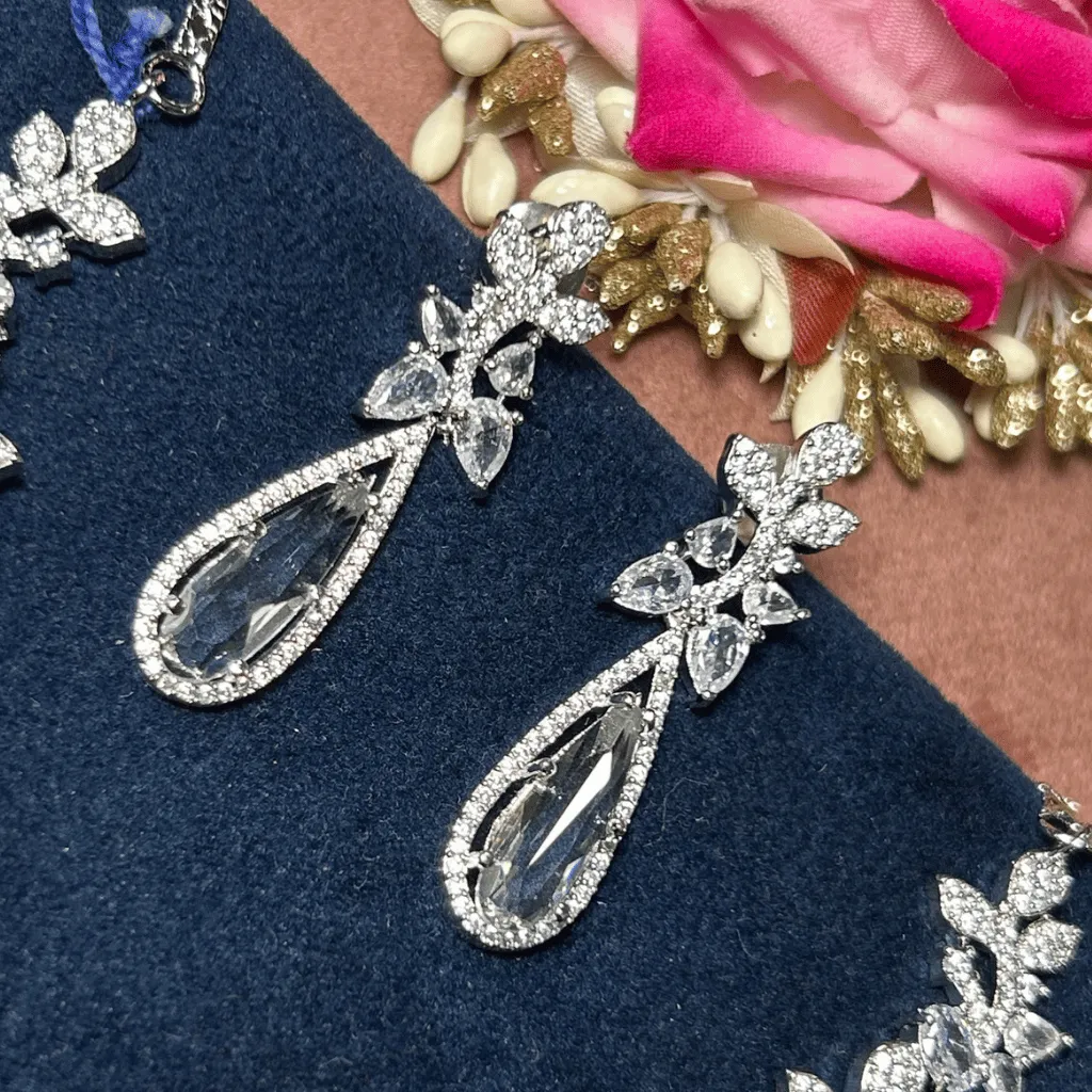 Elevate your festive wardrobe with this captivating AD diamond choker, artfully blending marquise-cut stones with deep emerald-green highlights. The sleek rhodium finish provides a cool, contemporary brilliance tailored for the Gen Z aesthetic. Lightweight and effortlessly chic, it’s the perfect minimal statement for weddings, engagements, or adding a touch of high-jewelry flair to your favorite festive ensemble.
