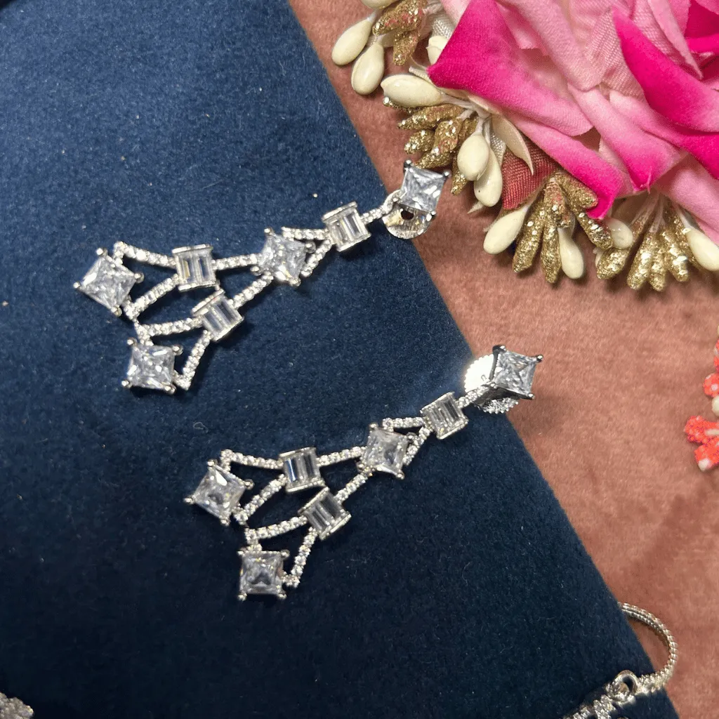 Redefine elegance with this striking AD diamond necklace, featuring a unique crescent-inspired layout of brilliant-cut stones. Finished in sleek rhodium for a high-wattage shine, this minimal yet bold design is curated for the modern Gen Z woman. Whether it’s an engagement party or a festive gala, this lightweight piece ensures a flawless, high-fashion look with every wear.